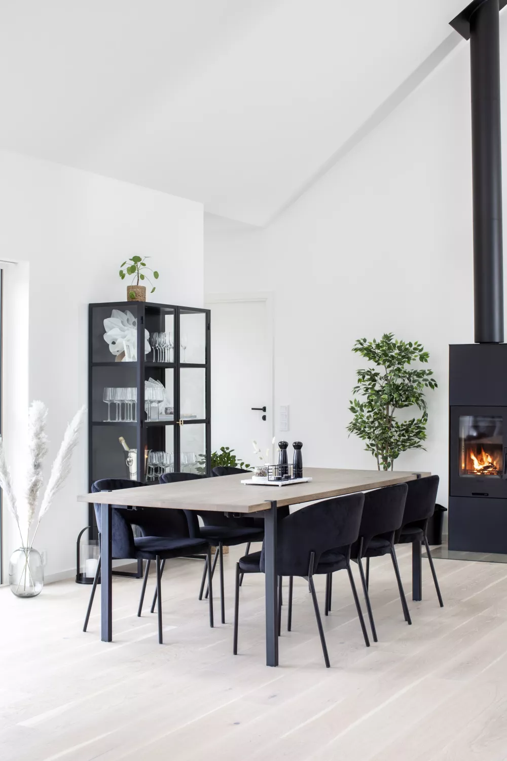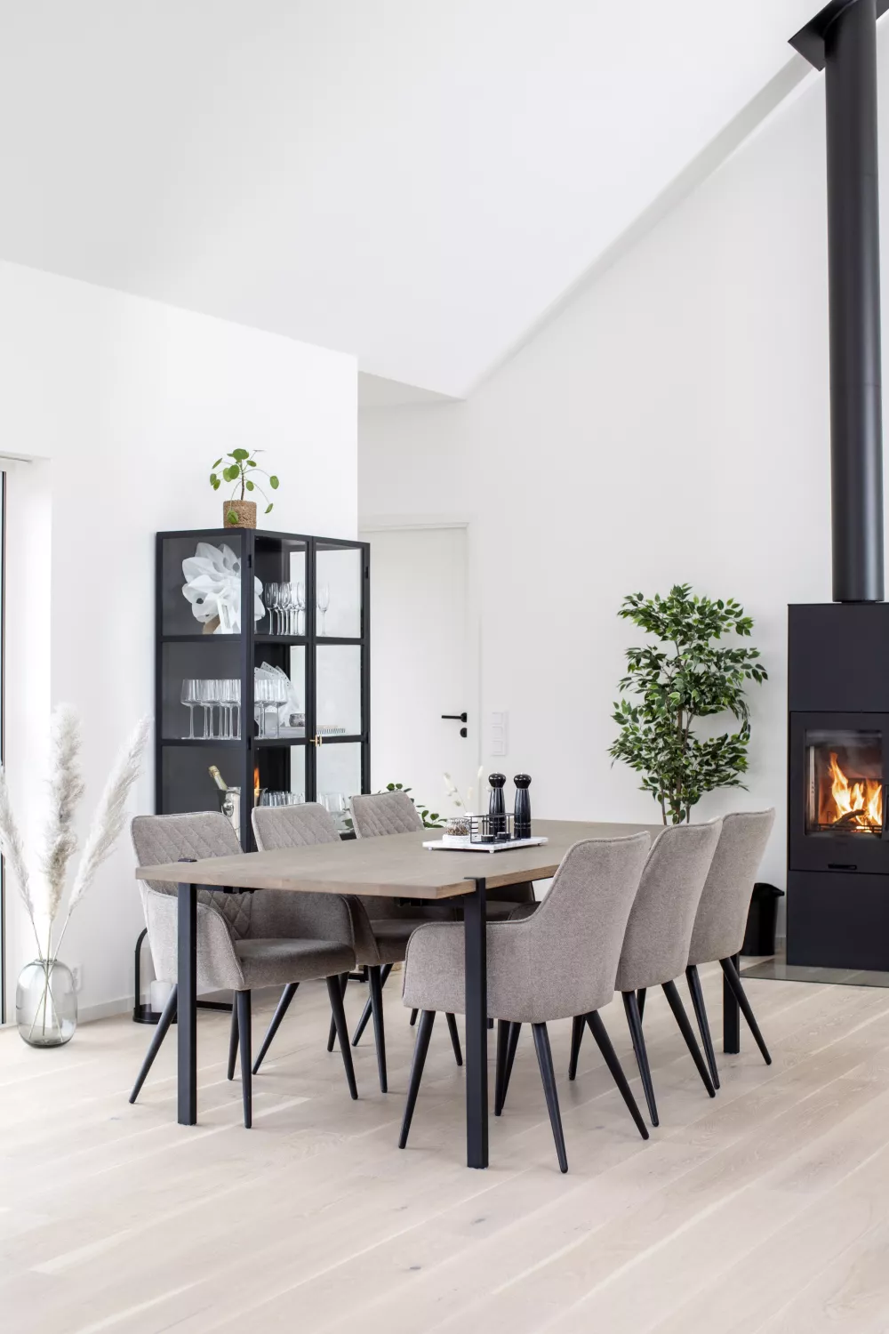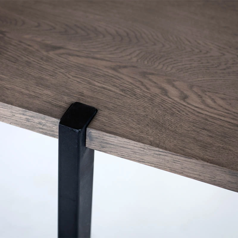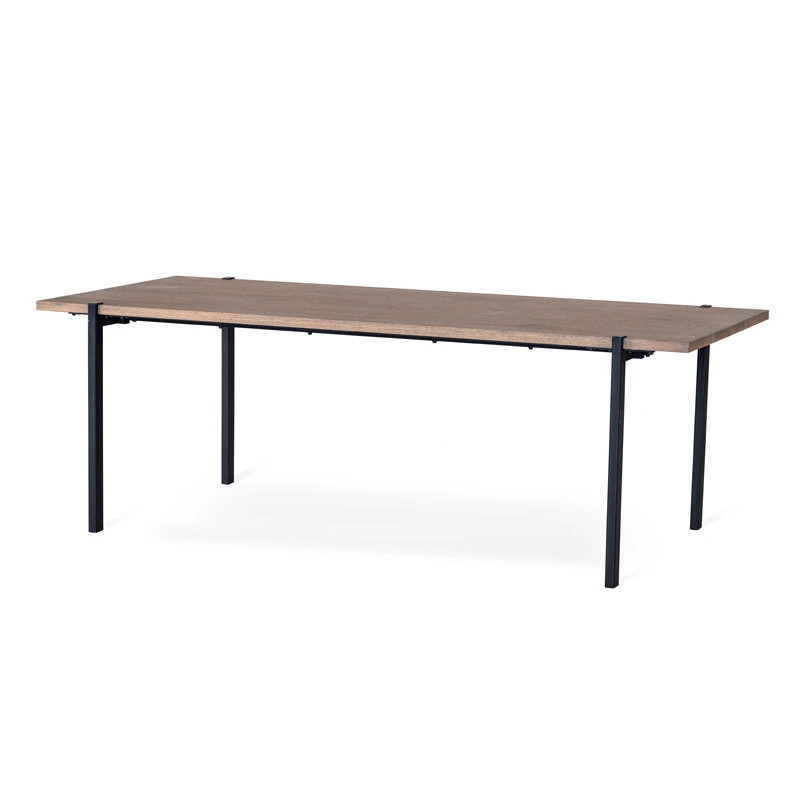 Aki matbord gråbetsad fanerad ek, ett modernt bord med plats för många. Bordsskivan är i gråbetsad fanerad ek med en klarlack på ytan. Benen är pulverlackade svart metall och är synliga på toppskivans ovansida som en fin detalj till bordets utseende. Bordet är utan tilläggsskiva 220 långt och 95 cm djupt. Det är möjligt att färlänga med tilläggsskiva på båda sidor till ett totalt mått på 320 cm.