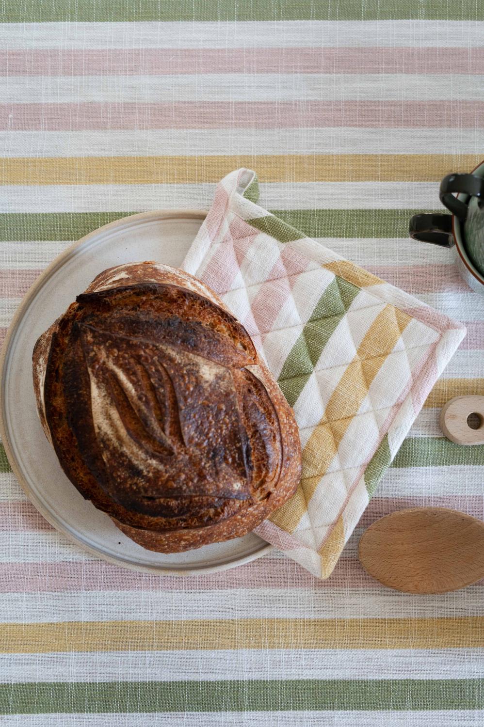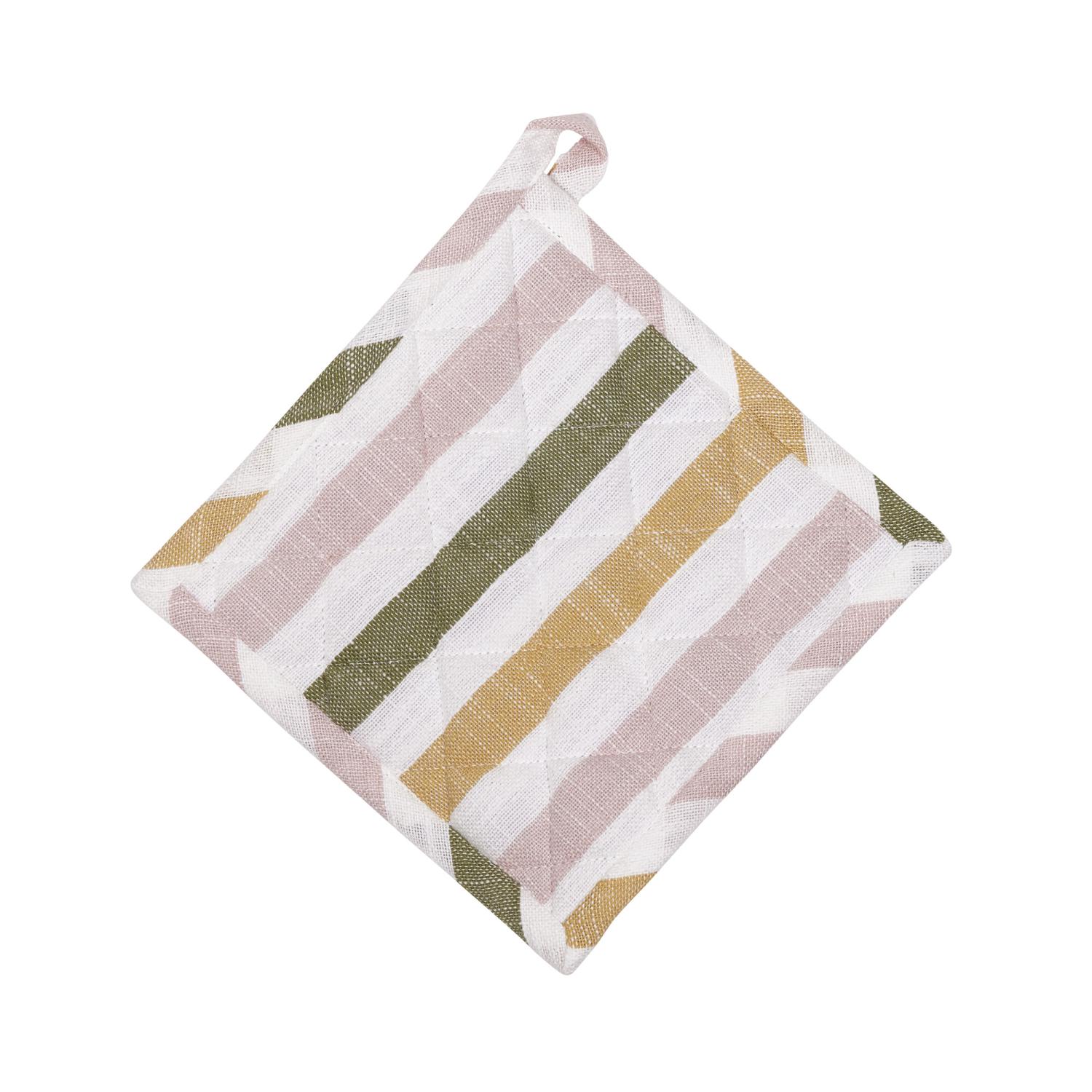 Söt grytlapp i 100% bomull med ett härligt, randigt mönster i färgerna rosa, grön och gult på vit botten som sprider glädje och färg i köket. Perfekt för att skapa en fin och välkomnande ljus känsla om vår i hemmet.