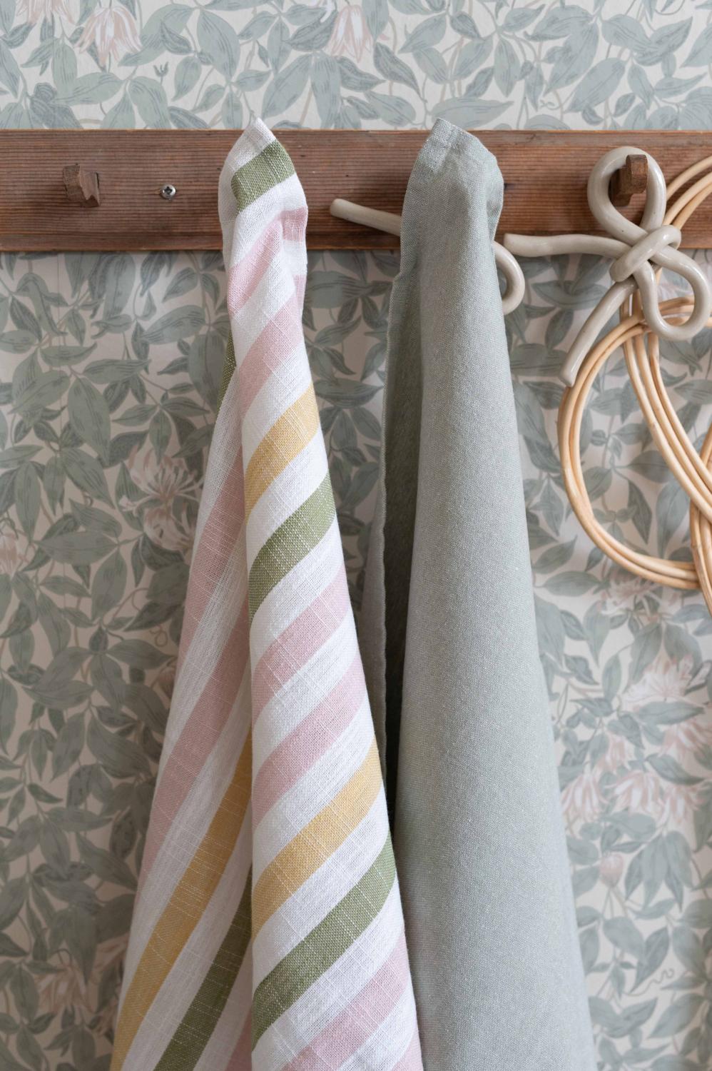Söt kökshandduk i 100% bomull med ett härligt, randigt mönster i färgerna rosa, grön och gult på vit botten som sprider glädje och färg i köket. Den mjuka bomullskvaliteten har god uppsugningsförmåga och en naturlig känsla – perfekt för att skapa en fin och välkomnande ljus känsla om vår i hemmet.