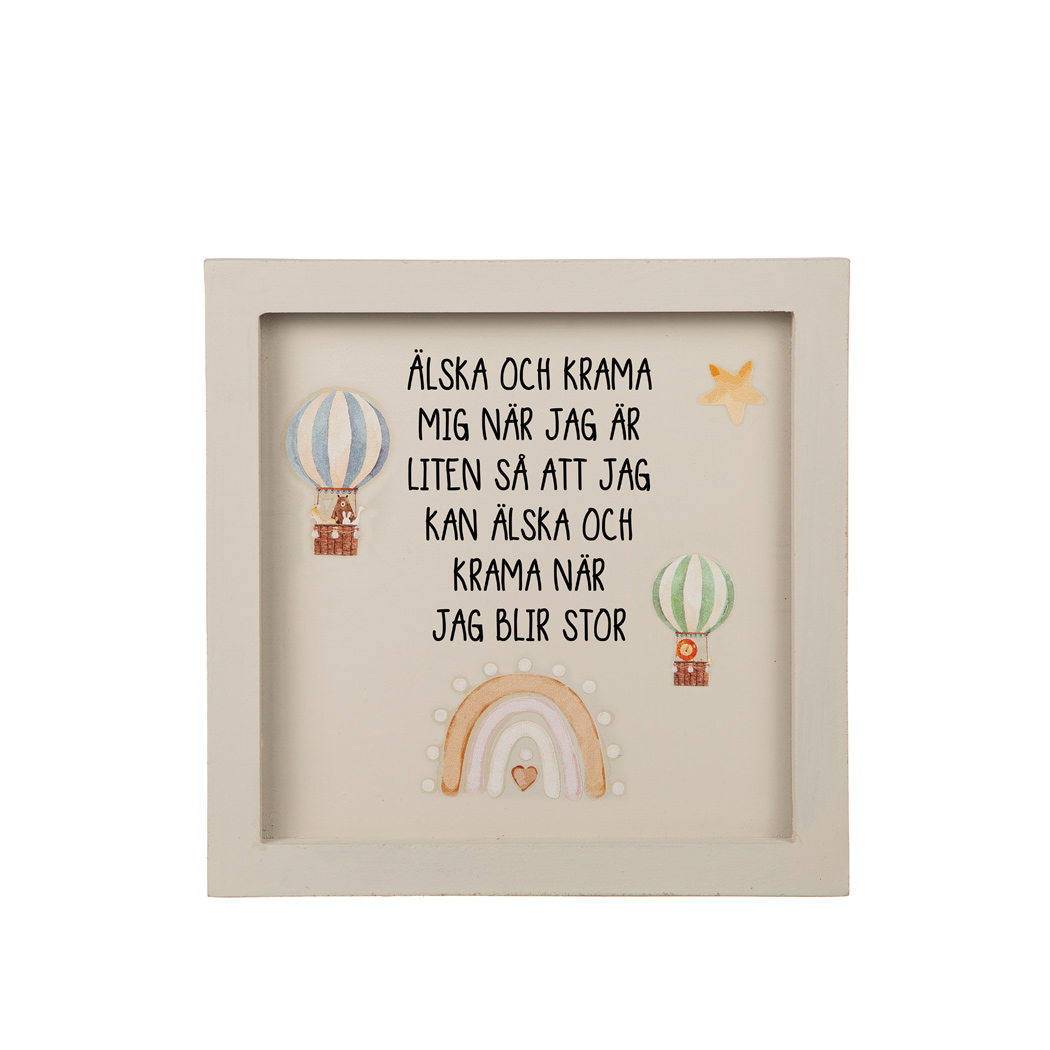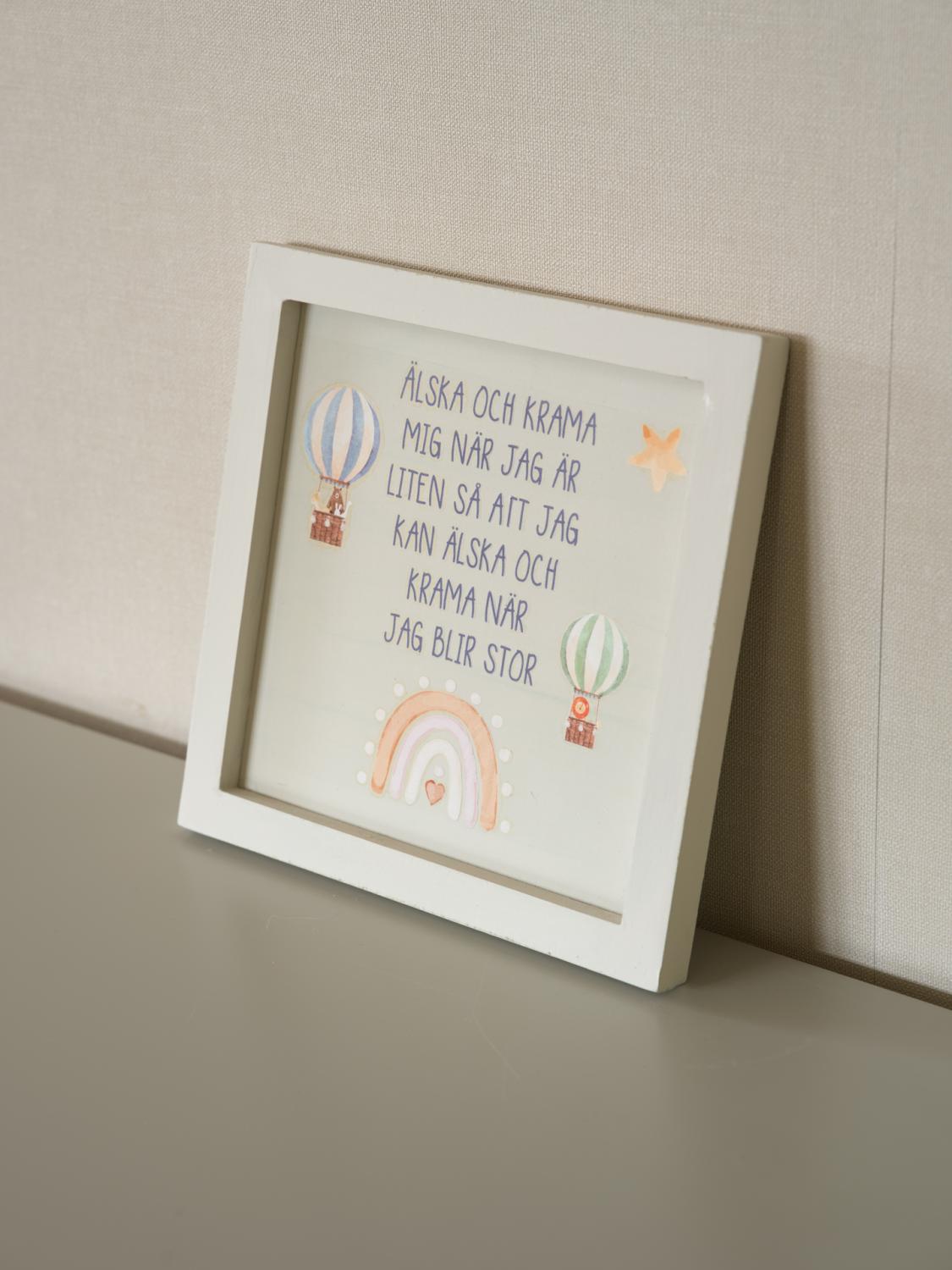 ''Älska och krama mig när jag är liten så att jag kan älska och krama när jag blir stor''. Tavlan har även luftballonger, en stjärna och en söt regnbåge som motiv. En fin dekoration till barnrummet.