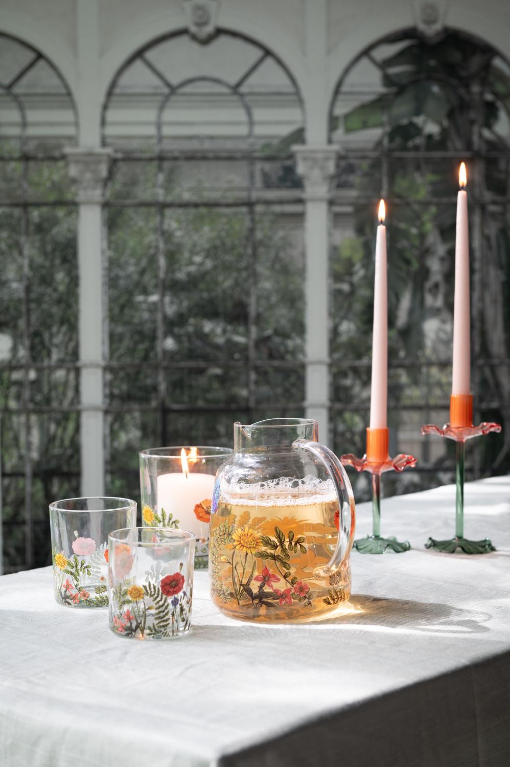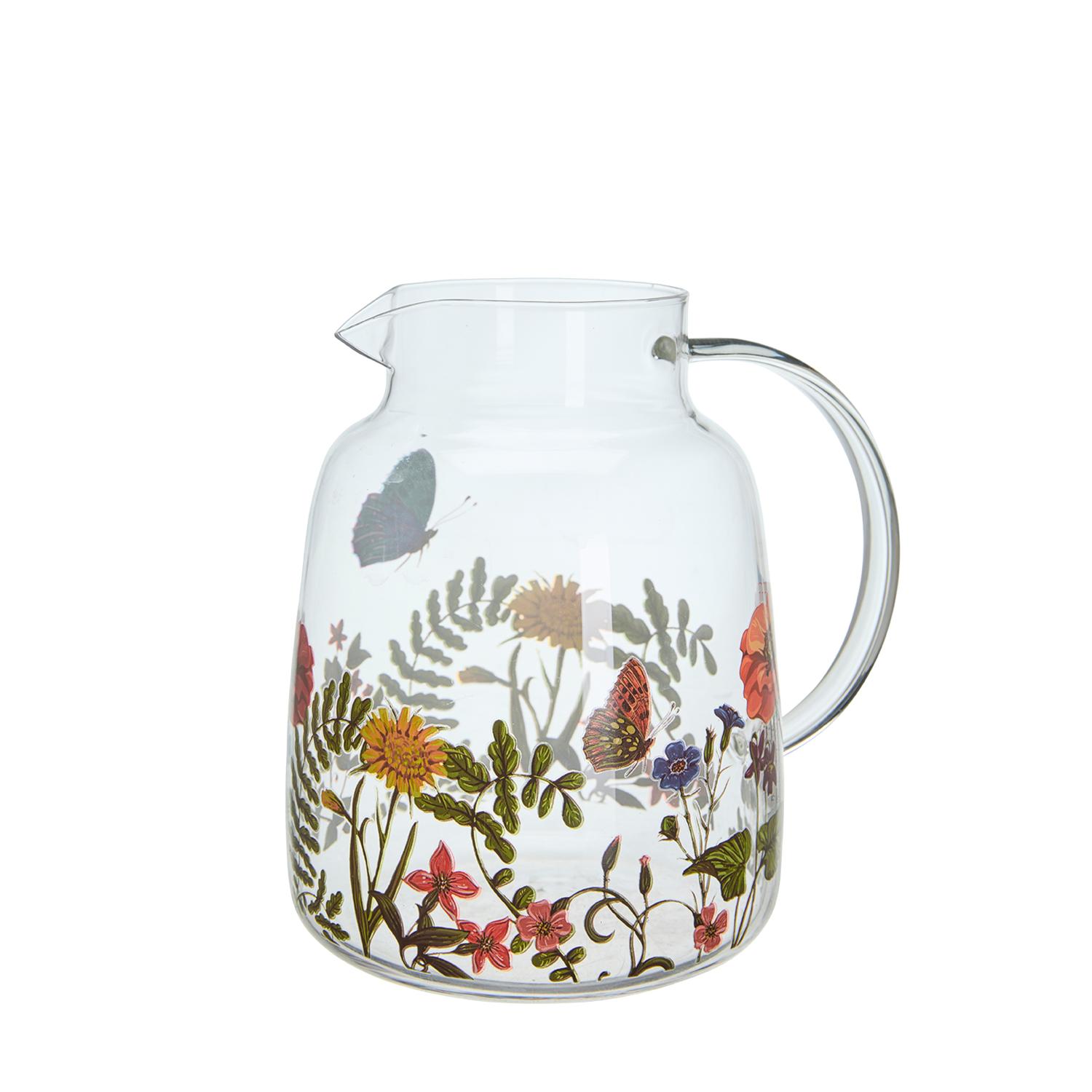 Söt glaskaraff med ett målat blommönster. Handtag för enkel upphällning. En perfekt karaff till sommarens alla fester. Som är både stilfull och användbar. Även en riktigt fin present att ge någon du tycker om.