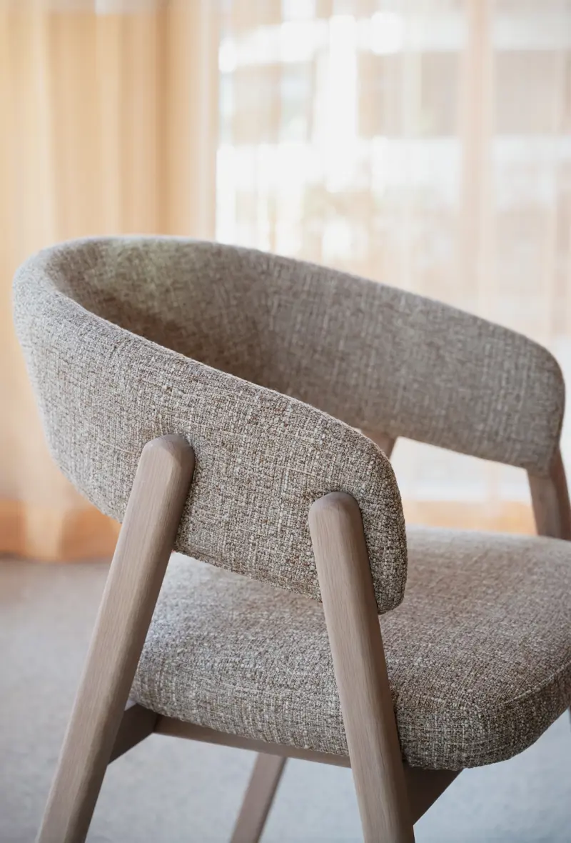 En modern klassiker med rundade former och en vackert öppen rygg som ger ett luftigt och tidlöst uttryck. Barnaby i mörkbeige textil ochvitpigmenterad ek är en karmstol som omedelbart känns välkomnande, där varje linje är mjukt formgiven för att skapa en harmonisk helhet. Kombinationen av elegant utformade trädetaljer och den omsorgsfullt balanserade siluetten ger stolen en naturlig värme och ett uttryck som både står ut och smälter in beroende på miljö.Stolen är inte bara tilltalande visuellt, den är också skapad för att sitta länge i. De rundade formerna följer kroppens naturliga konturer och ger ett behagligt stöd, medan den öppna ryggen bidrar till en lätthet som gör att rummet känns mer rymligt. Det är en design som bjuder in till långa samtal runt bordet, lika mycket som till stunder av stillhet och reflektion.