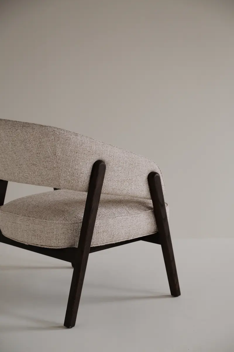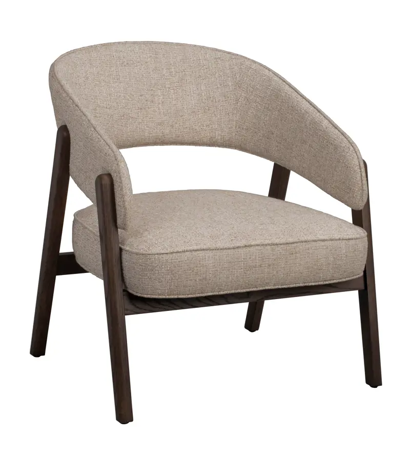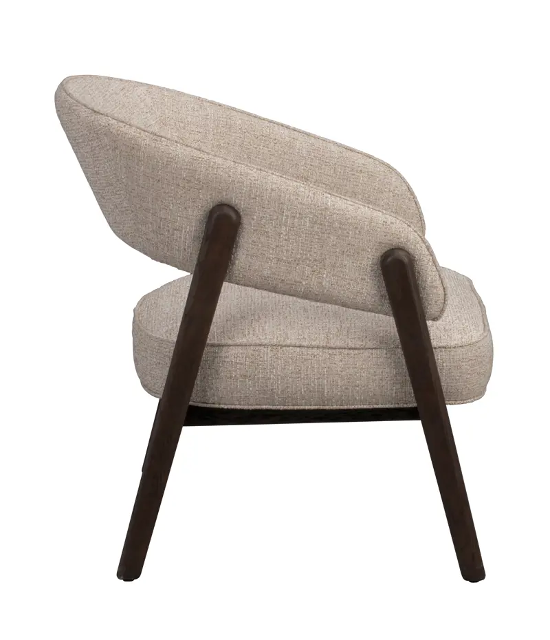 En modern loungestol som förenar mjuka, rundade former med en öppen och inbjudande siluett. Barnaby loungestol i ljusbeige textil och brun ek är skapad för att ge ett avkopplande andrum i hemmet, där varje detalj är utformad för att erbjuda både komfort och visuellt lugn. De vackra trädetaljerna ramar in sitsen och skapar en harmonisk kontrast mellan naturlig värme och elegant formgivning, vilket ger stolen en tidlös karaktär.