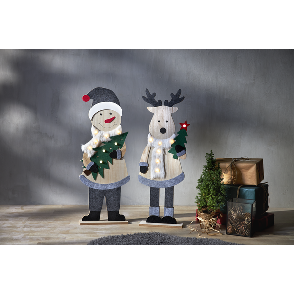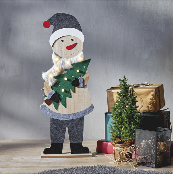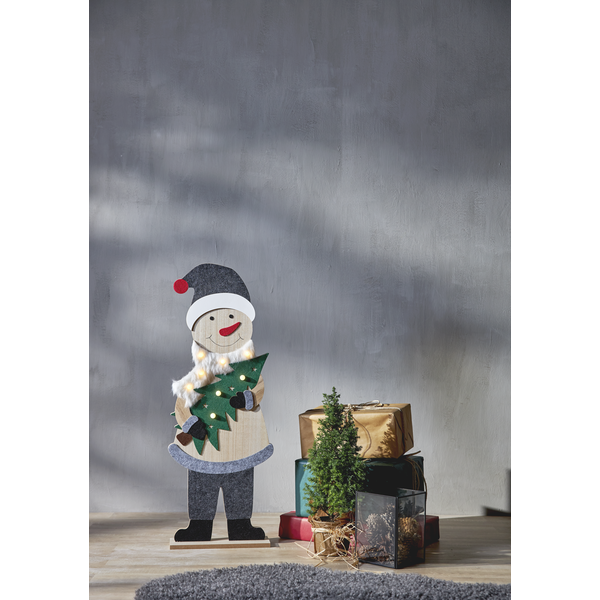 En 80cm hög snögubbe med en gran i famnen. Figuren är utskuren i mdf med detaljer i textil. Figuren har små ljuspunker av led för att ge ett fint och stämningsullt intryck. Dekorera barnrummet till julen eller placera figuren vid granen eller dörren.