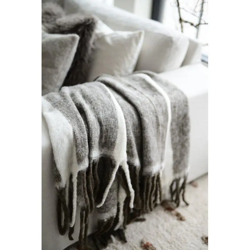 En fluffig och mysig pläd med breda ränder och tjocka, tvinnade fransar längs kanterna, tillverkad av akryl och ull. Akrylfibrerna hjälper pläden att behålla sin form och mjukhet över tid, medan ullen ger naturlig värme och en lyxig känsla.