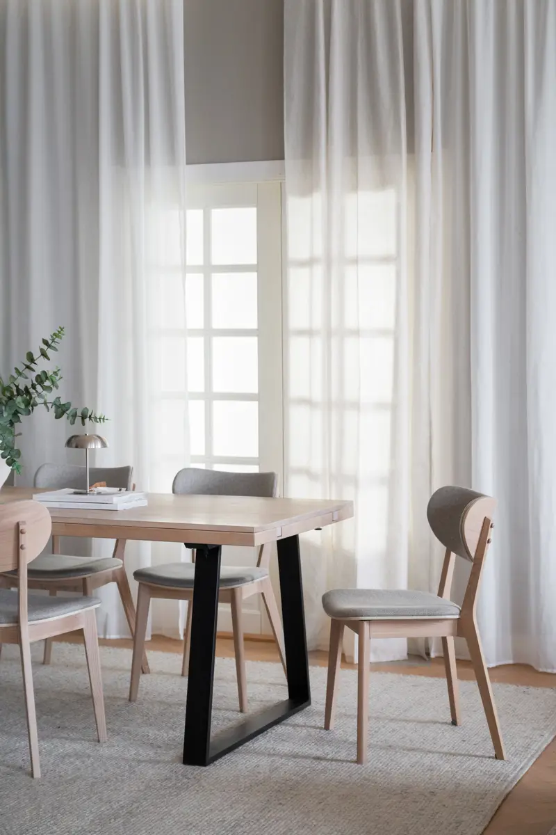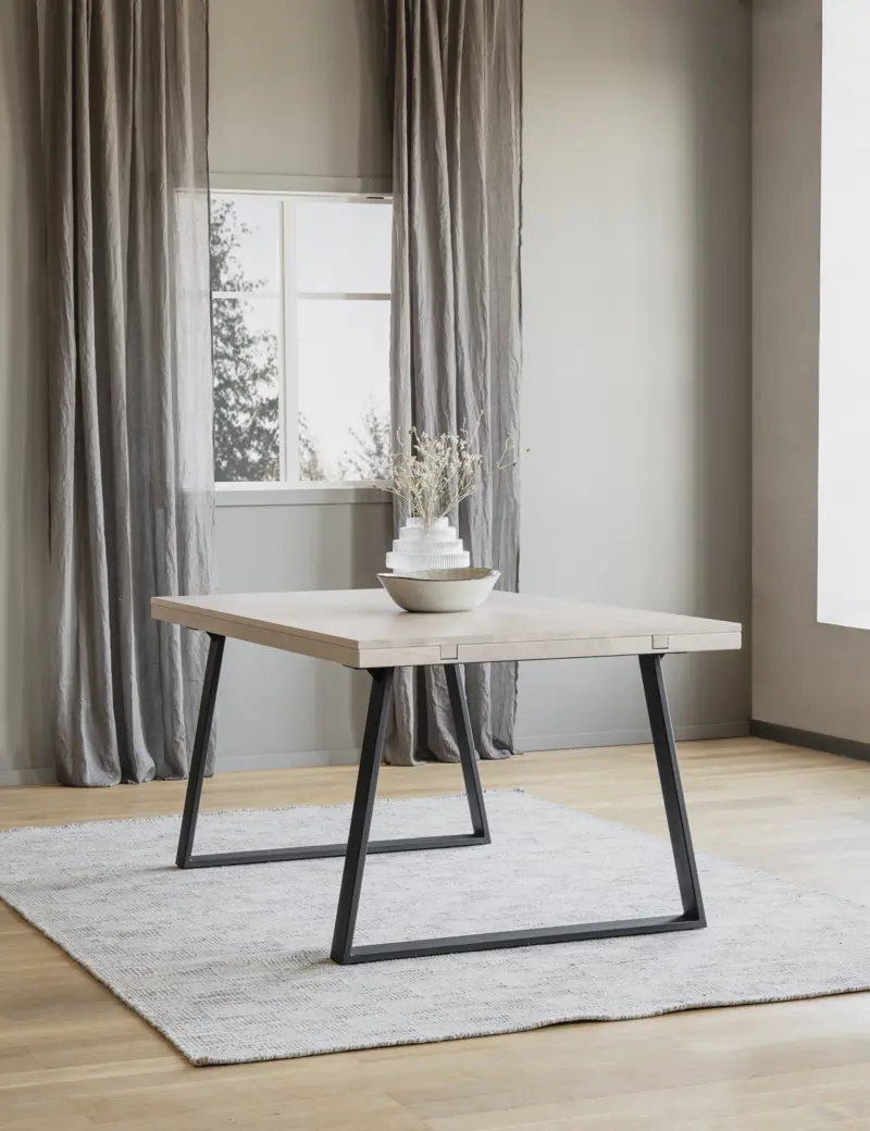 Material: Massiv fingerskarvad Europeisk ek i vitpigmenterad olja. Utdragsreglar till tilläggsskivor i massiv ek. Ben i pulverlackad metall med sandstruktur.