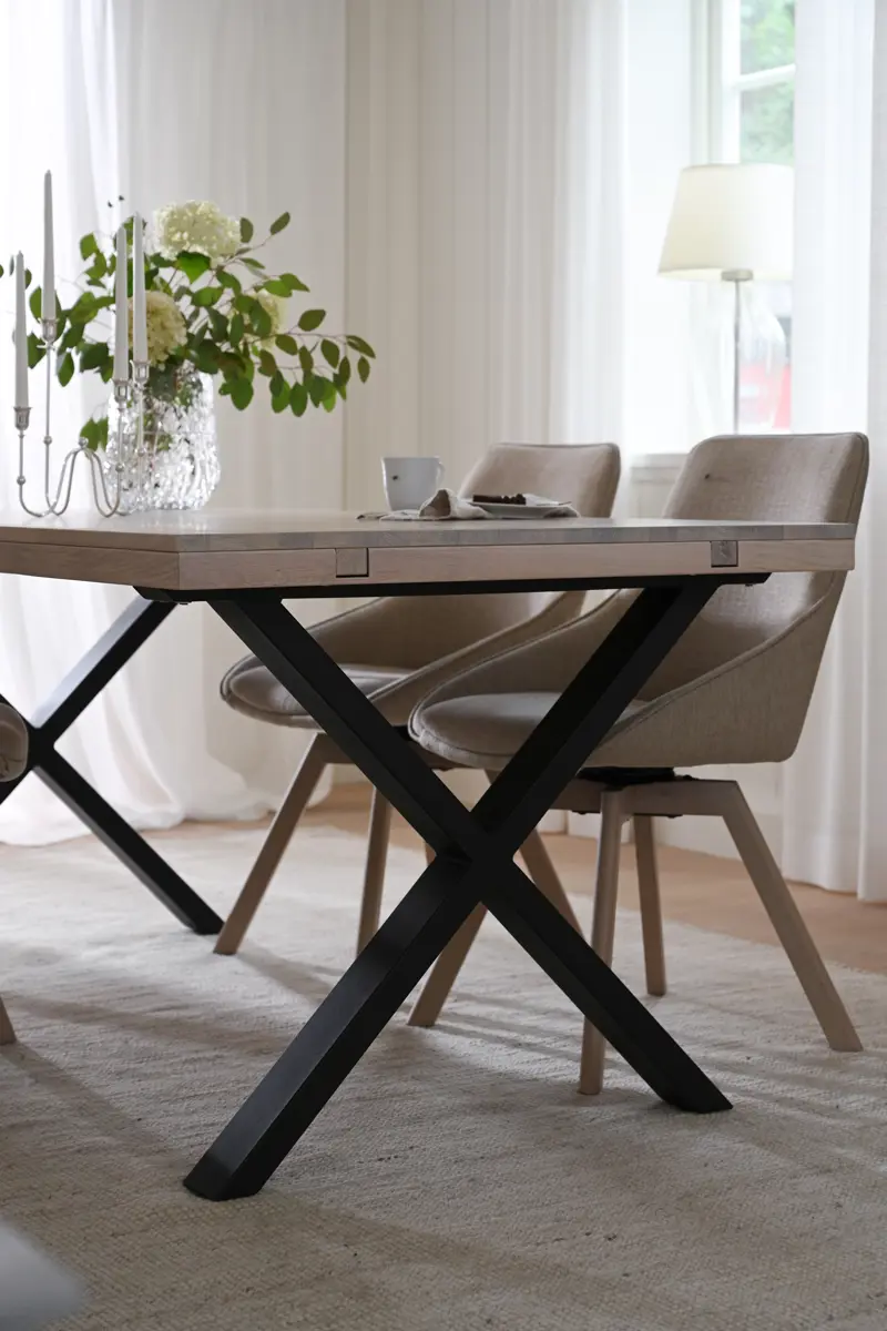 Material: Massiv fingerskarvad Europeisk ek i vitpigmenterad olja. Utdragsreglar till tilläggsskivor i massiv ek. Ben i pulverlackad metall med sandstruktur.