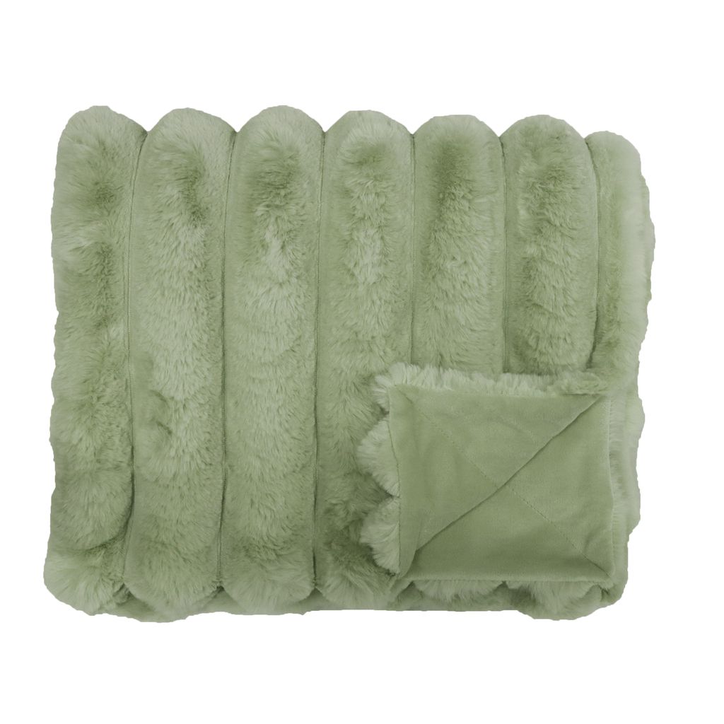 Lyxig pläd i ljusgrönt med extra mjuk och skön fuskpäls i breda ränder på framsidan, mikromink på baksidan.