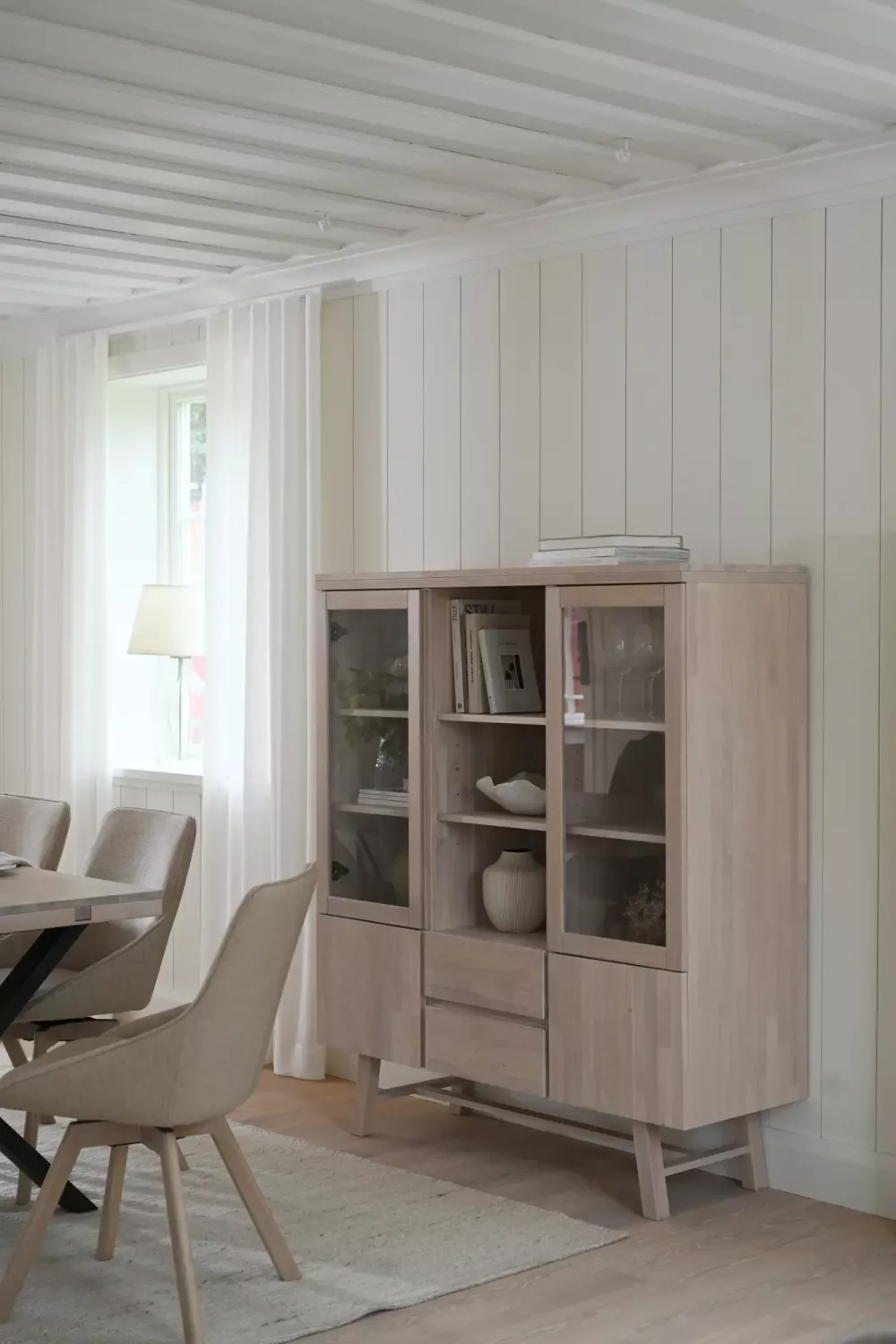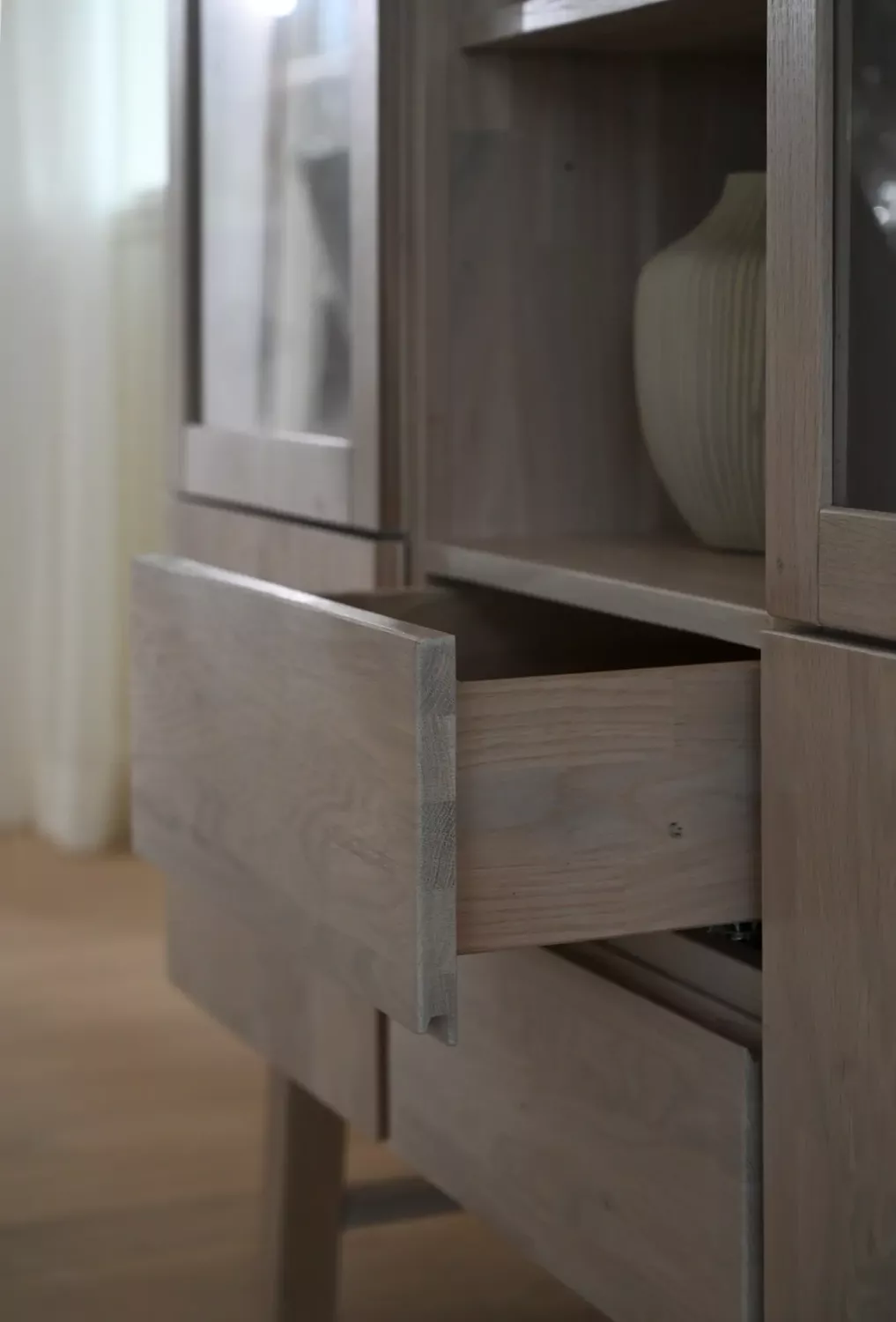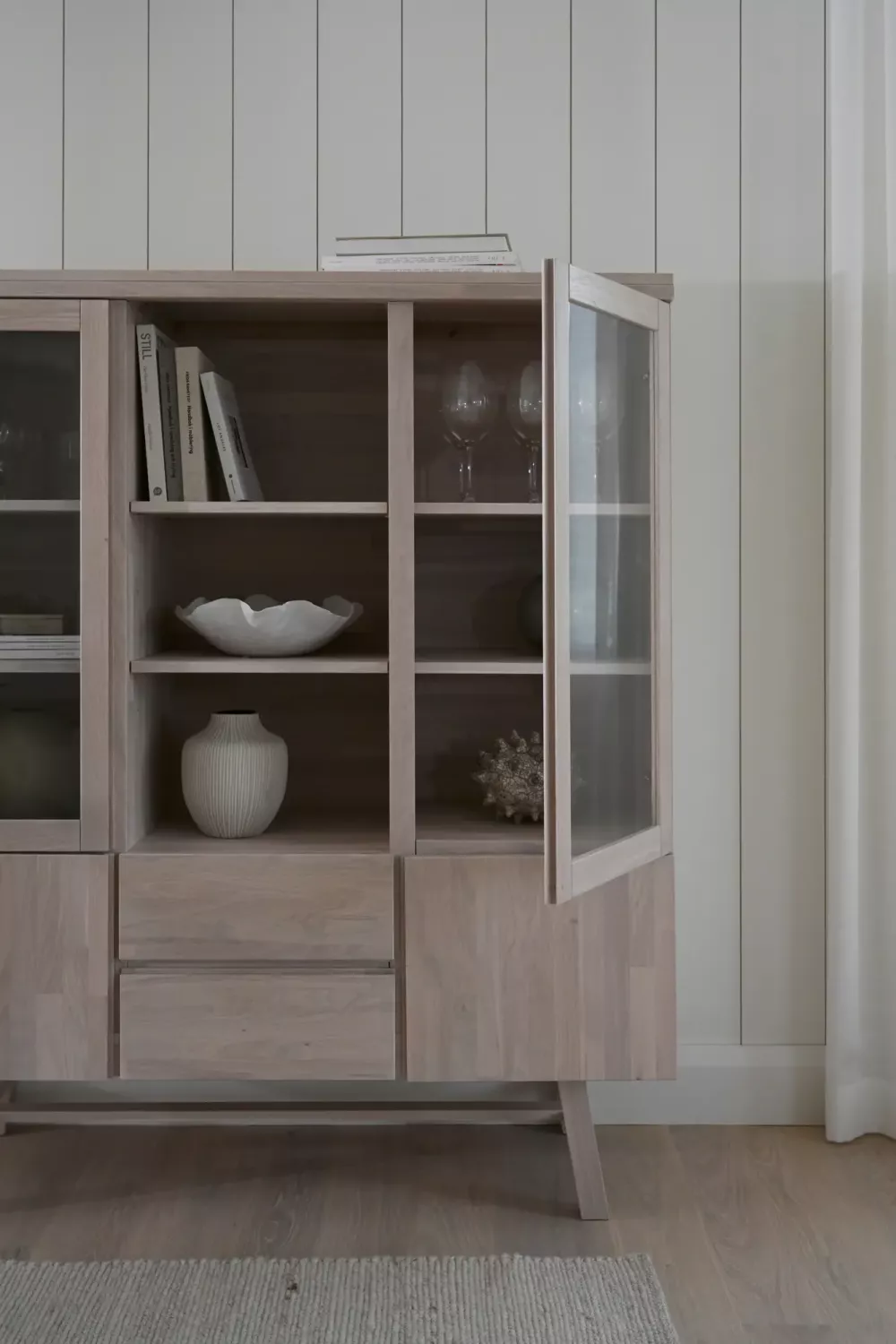 Funktionellt skåp i stilren skandinavisk design med gott om förvaring och mjukstängande sk soft-close funktion på lådor och luckor. Tillverkat i massiv, fingerskarvad, europeisk ek som behandlats med vitpigmenterad olja.