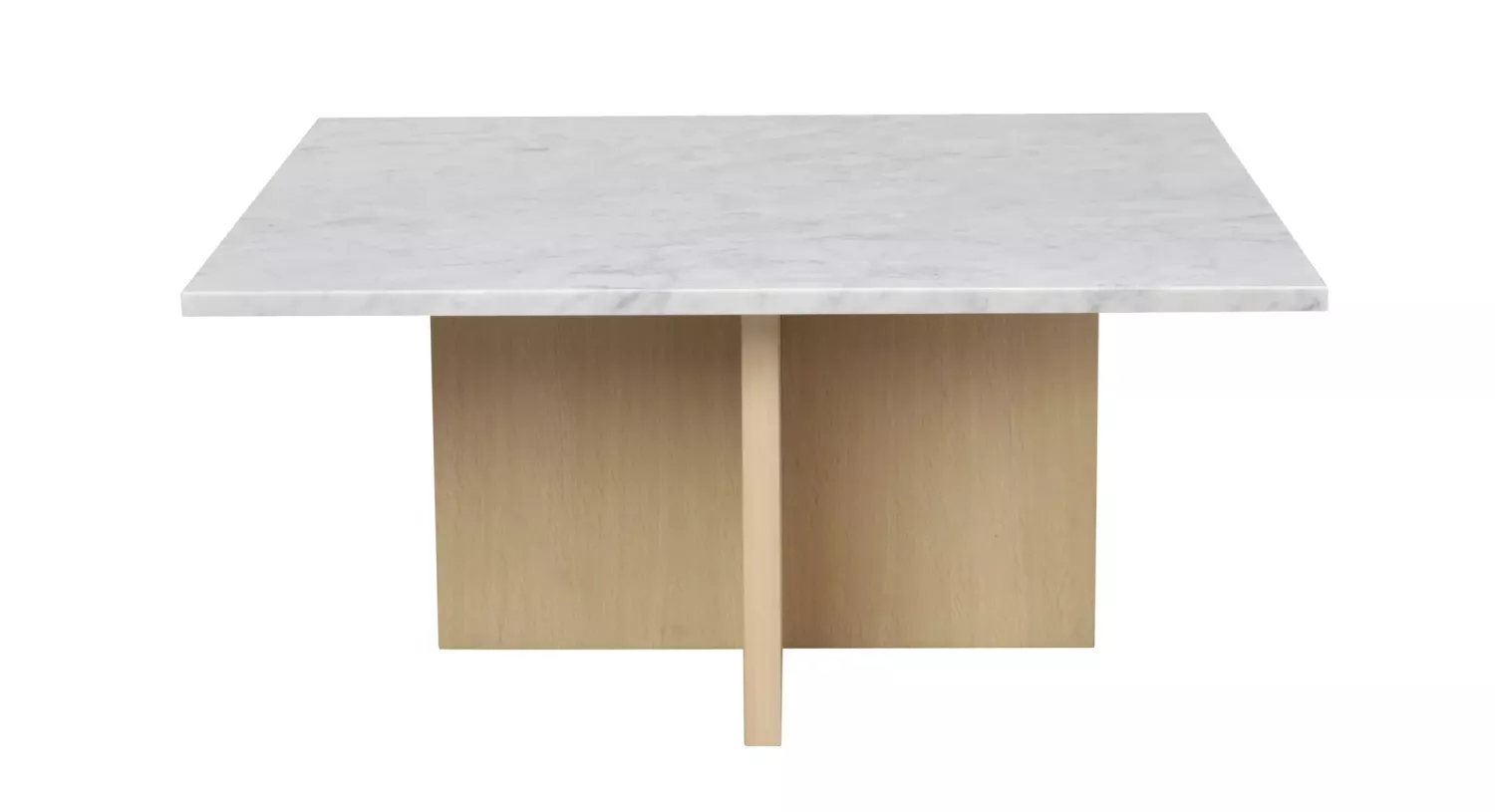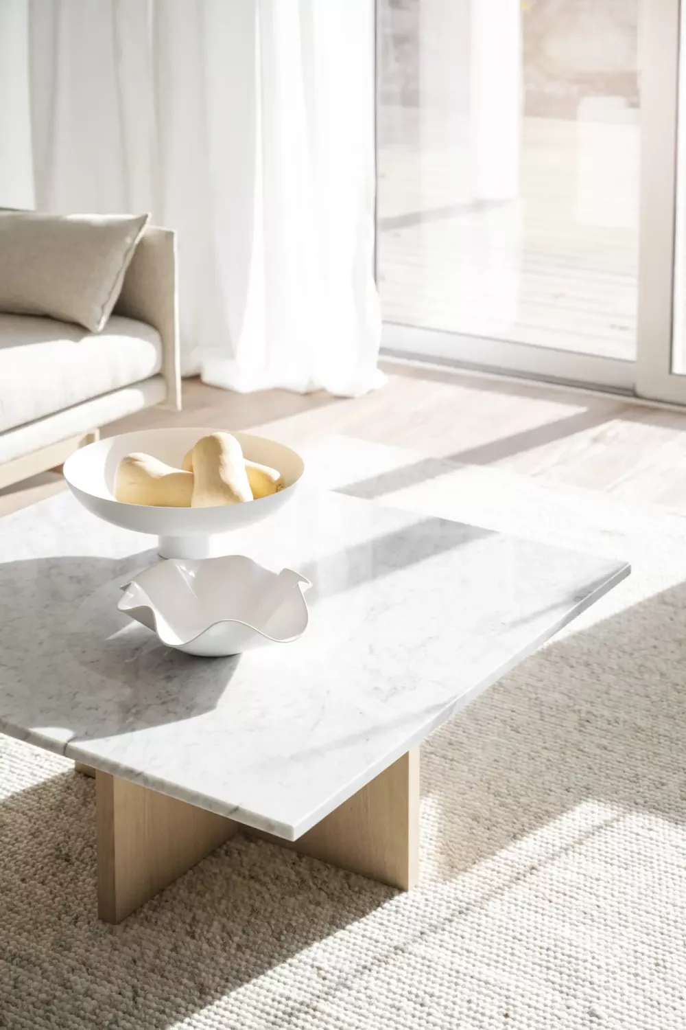 Den kvadratiska bordsskivan av exklusiv italiensk Carrara-marmor tillsammans med kryssunderredet av FSC-certifierat vitpigmenterat trä skapar ett hållbart soffbord och ger en rofylld känsla i rummet.