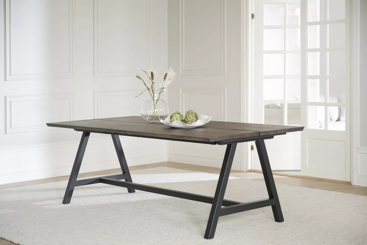 Tvådelad massiv bordsskiva med borstad yta och A-formade ben i svart pulverlackad metall.