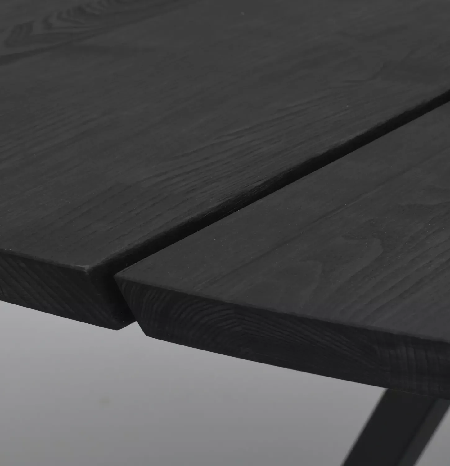 Tvådelad massiv bordsskiva med borstad yta och A-formade ben i svart pulverlackad metall.