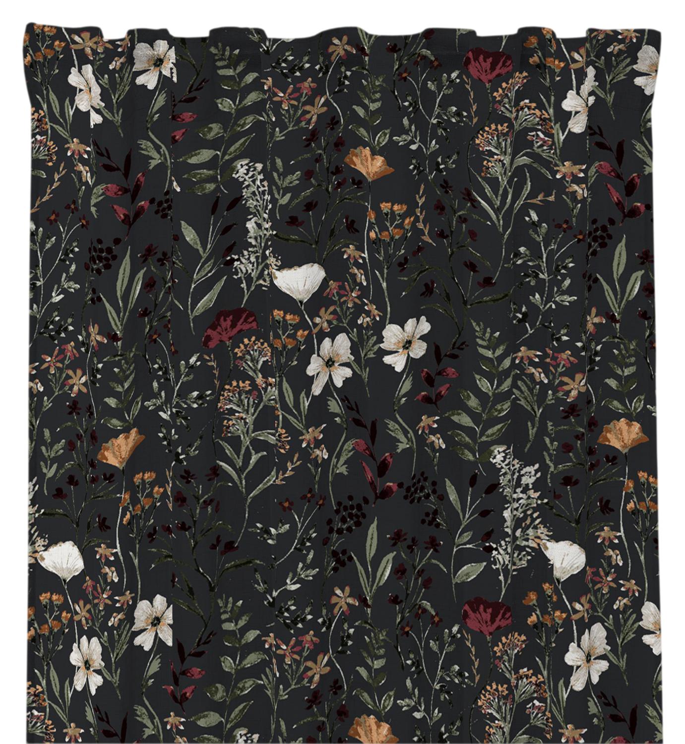 Färdigsydda multibandslängder i 2-pack. Vackert mönster med gula, röda och vita blommor och blad på svart botten. Slubkvalité overlock nertill.