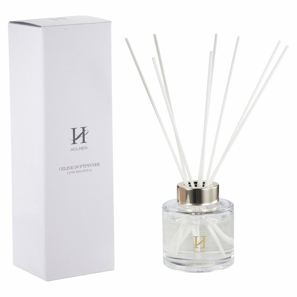 Eleganta och delikata doftstickor i doften Lush Magnolia från serien Celine. En mjuk, blommig och harmonisk arom som ger hemmet en lugn och sofistikerad stämning.