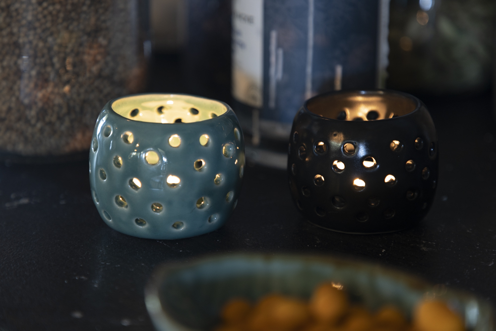 Vacker och unik ljuslykta i brunmålad keramik med stansade hål som släpper igenom skenet från ljuset. Otroligt vacker nu när det mörknar utomhus. Matcha gärna med de andra färgerna.