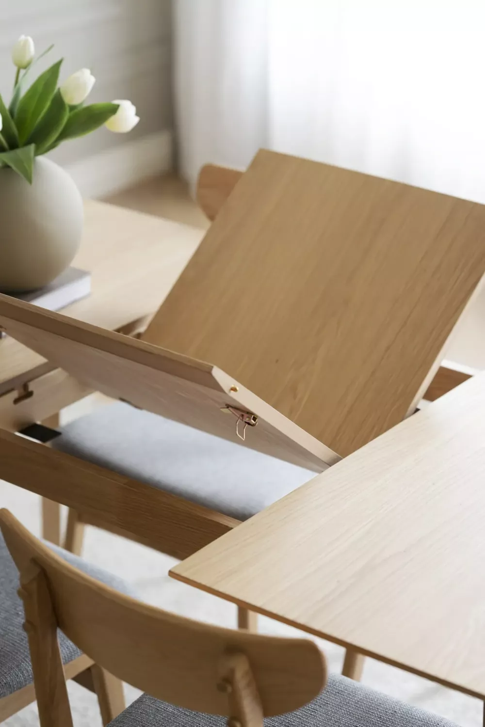 Matbordet har en dold iläggsskiva under bordsskivan som är praktisk att ta fram vid behov.