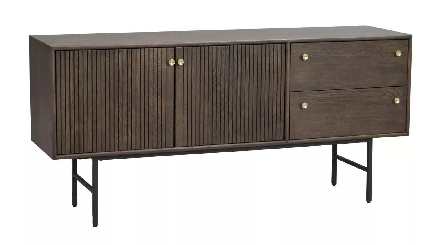 Clearbrook sideboard i en lackad brun ekfärg med svarta metallben.