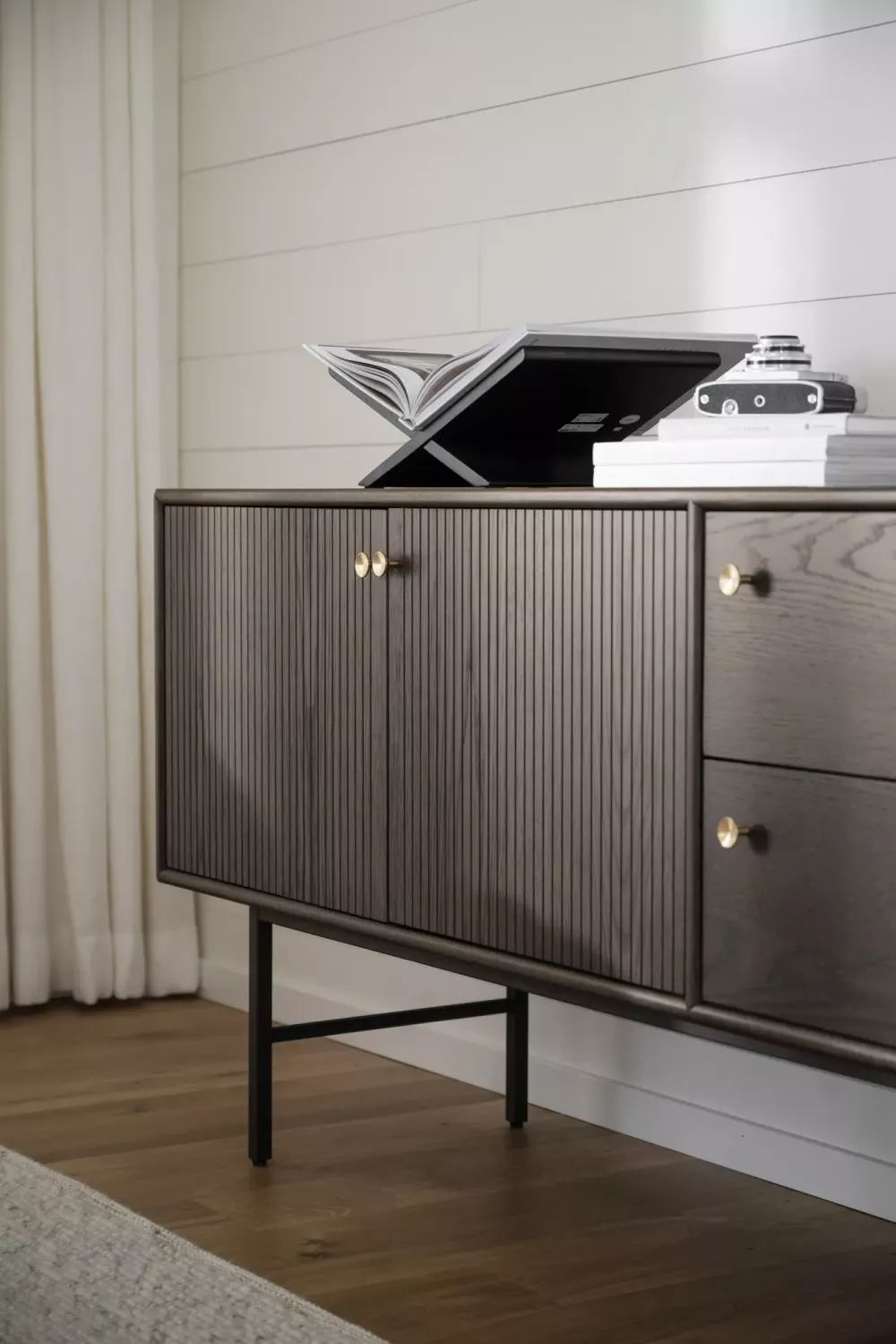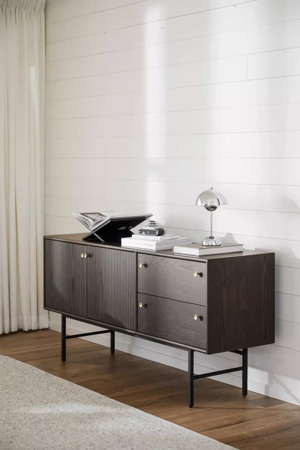 Sideboardet har praktiska lådor på ena sidan och mässingsfärgade beslag.