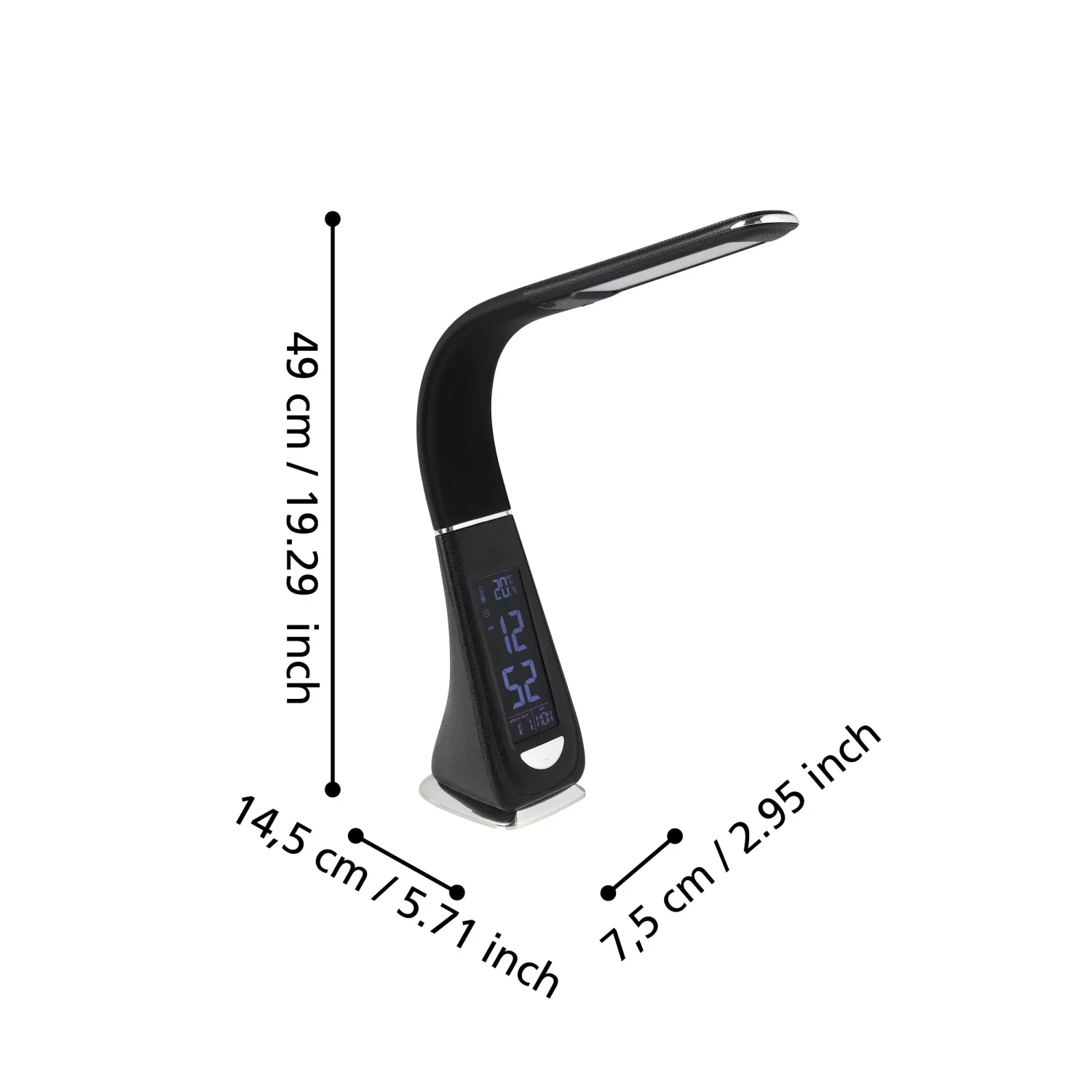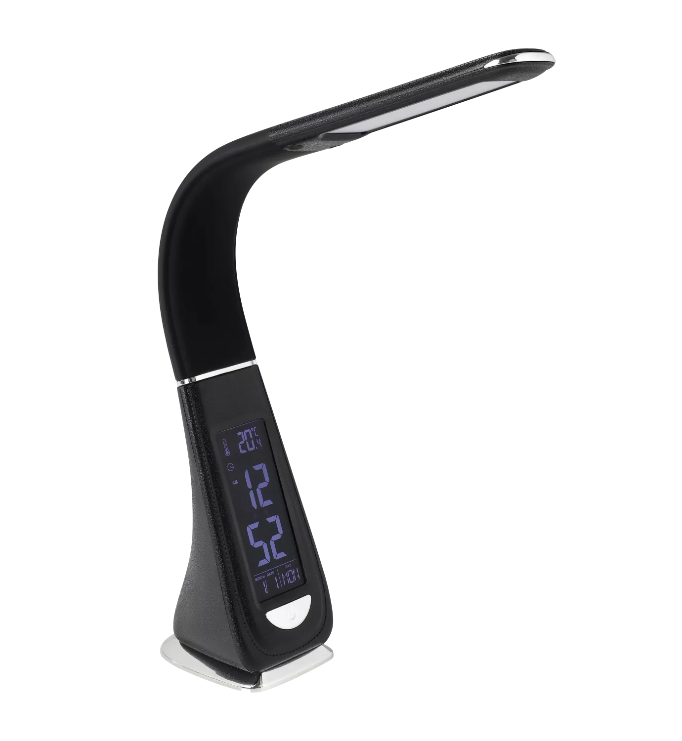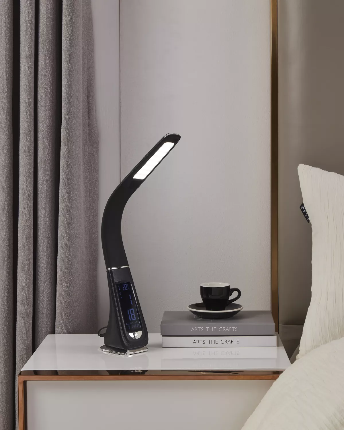 Cognoli LED-skrivbordslampa är tillverkad av svart plast med kromfärgade detaljer. De integrerade lysdioderna producerar ett neutralt vitt ljus som är perfekt vid arbete. Tack vare den flexibla halsen kan produkten omedelbart ge fokuserad belysning för din arbetsplats. Skrivbordslampan har en trestegs touchdimmer. Förutom att visa tid, temperatur och datum har lampan en larmfunktion med olika ljud. Med sitt moderna utseende och attraktiva plastdetaljer som påminner om lädersömmar är denna lampa garanterat ett praktiskt men ändå dekorativt måste för din arbetsplats, oavsett om det är på skrivbordet på ditt kontor eller ditt hemmakontor. Bordslampan är flexibla och ger det ljus du behöver på din arbetsplats. Den inbyggda displayen visar dessutom datum, tid och temperatur.