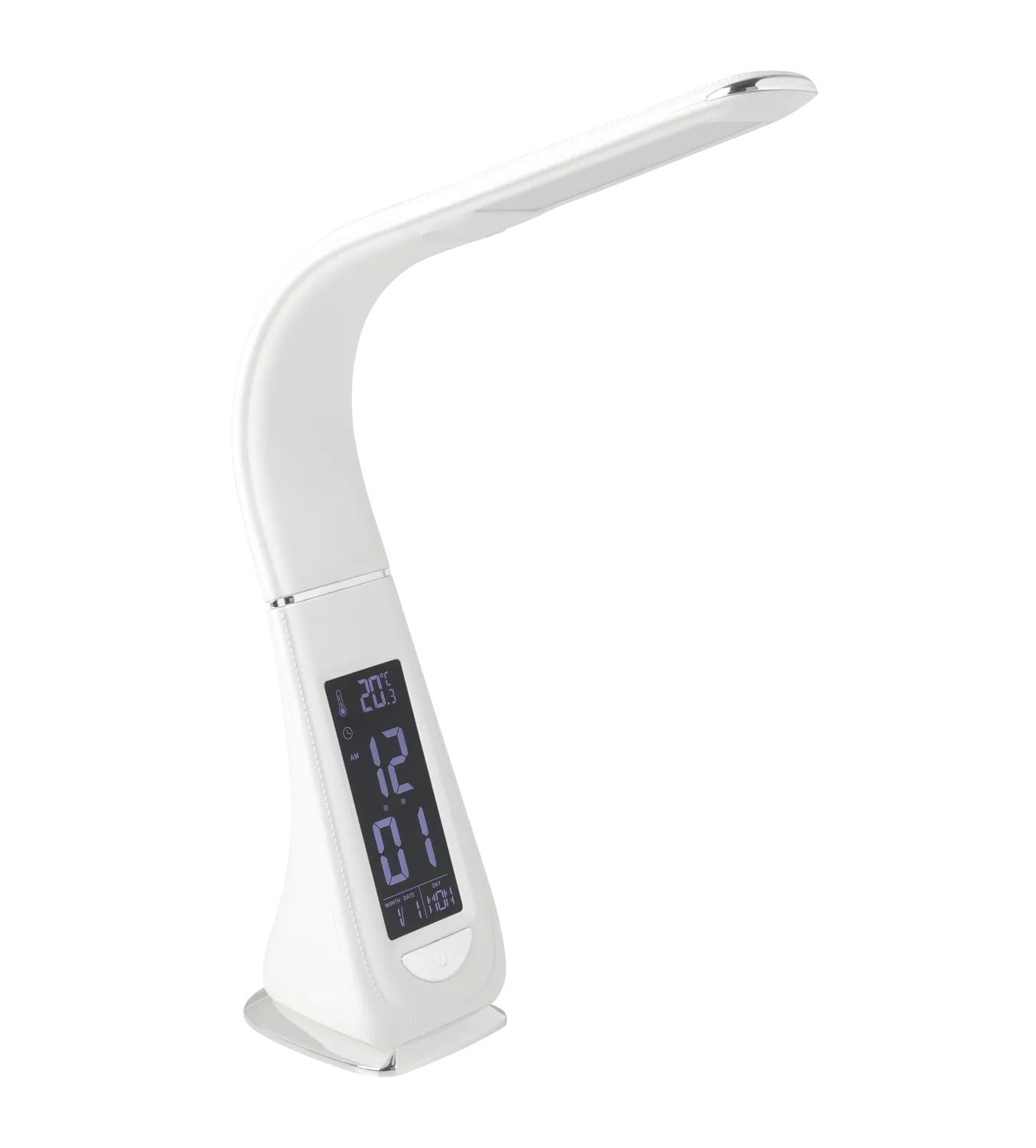Cognoli LED-skrivbordslampa är tillverkad av svart plast med kromfärgade detaljer. De integrerade lysdioderna producerar ett neutralt vitt ljus som är perfekt vid arbete. Tack vare den flexibla halsen kan produkten omedelbart ge fokuserad belysning för din arbetsplats. Skrivbordslampan har en trestegs touchdimmer. Förutom att visa tid, temperatur och datum har lampan en larmfunktion med olika ljud. Med sitt moderna utseende och attraktiva plastdetaljer som påminner om lädersömmar är denna lampa garanterat ett praktiskt men ändå dekorativt måste för din arbetsplats, oavsett om det är på skrivbordet på ditt kontor eller ditt hemmakontor. Bordslampan är flexibla och ger det ljus du behöver på din arbetsplats. Den inbyggda displayen visar dessutom datum, tid och temperatur.