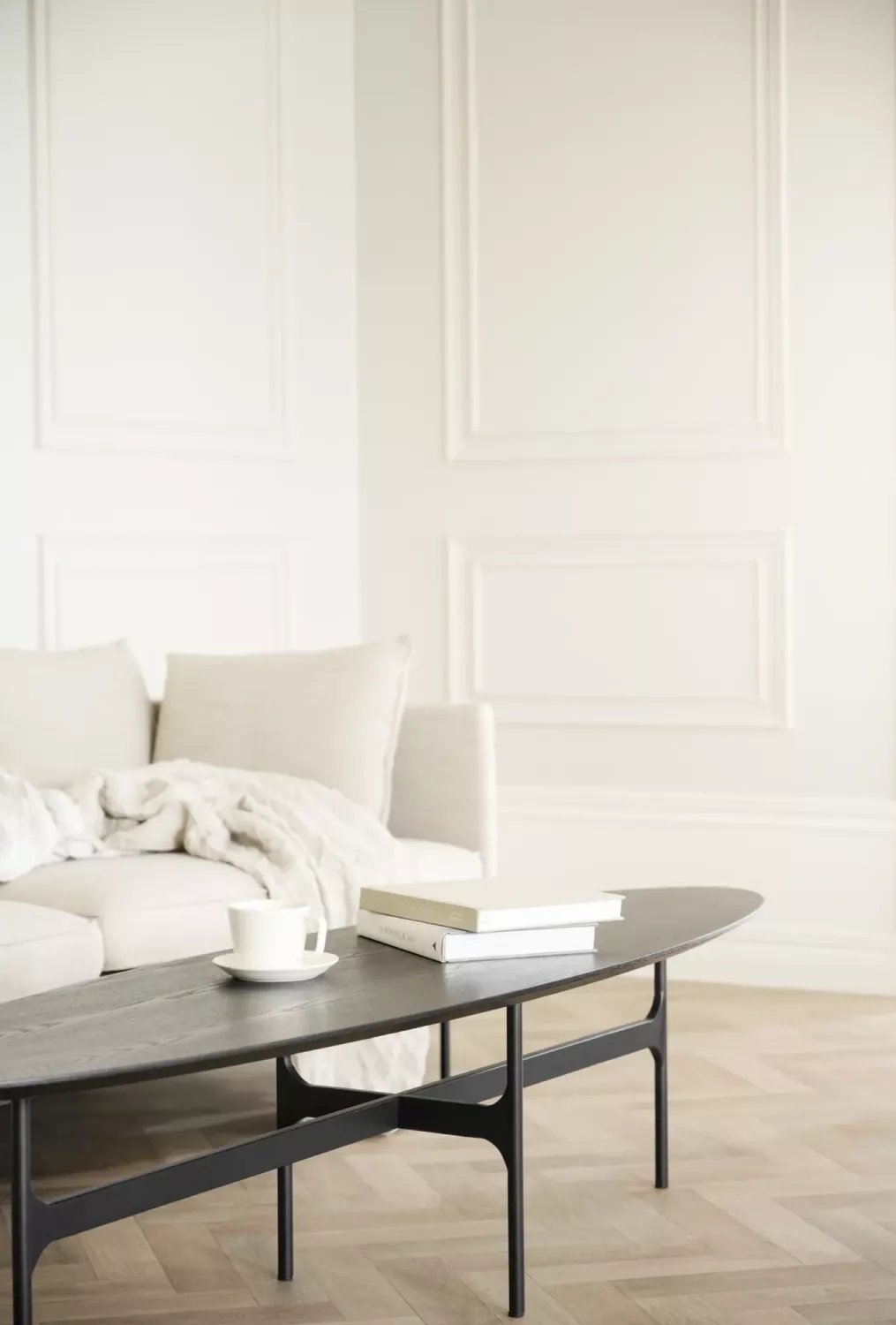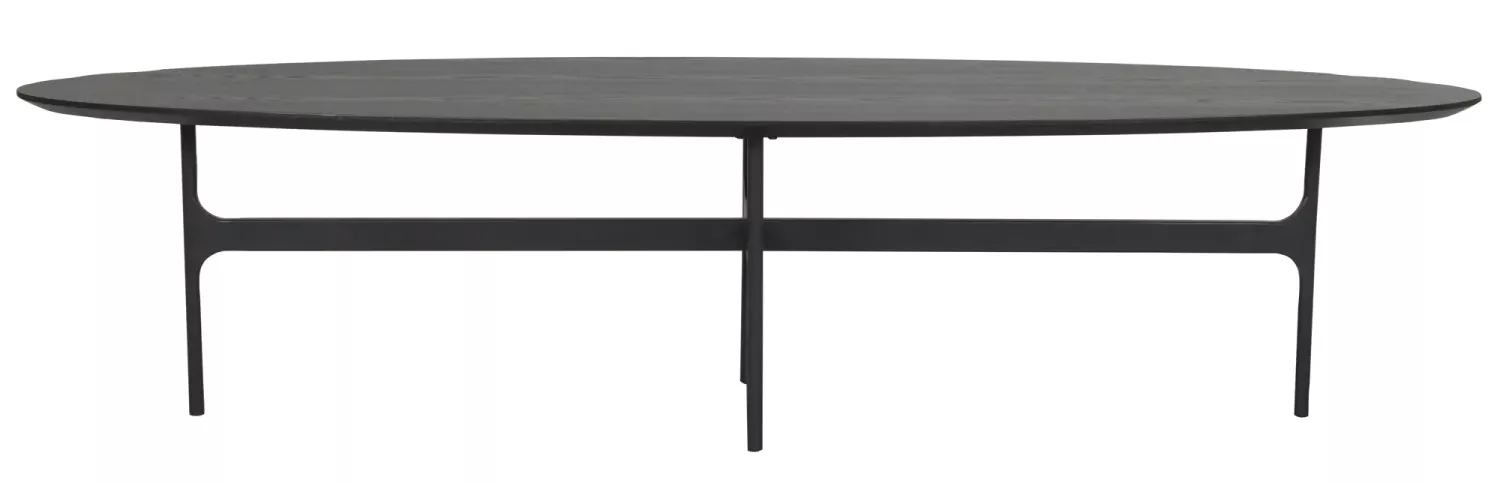 Colton ovalt soffbord i lackad fanerad ask med svarta metallben och dekorativt kryssunderrede passar perfekt i det moderna hemmet.