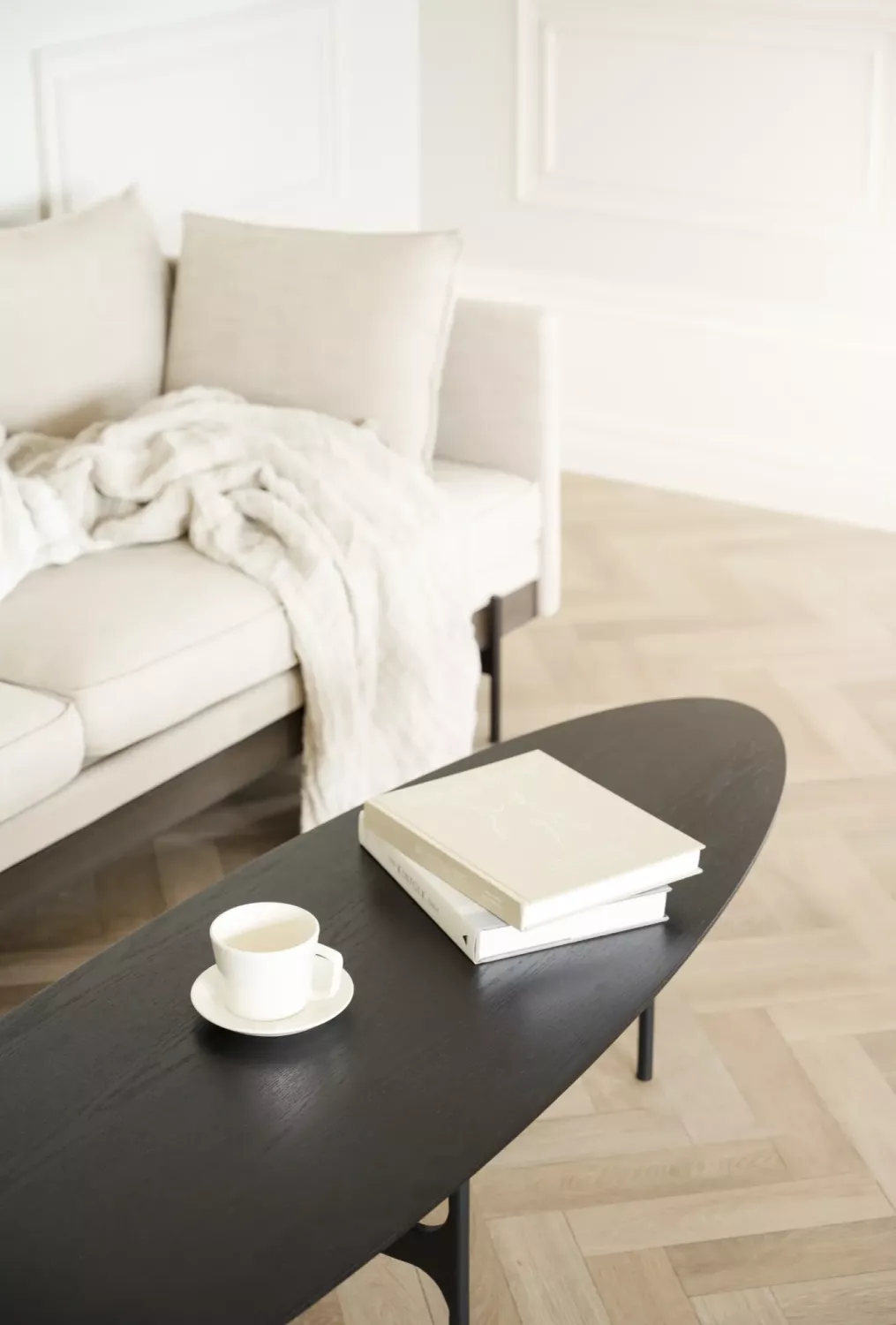 Den ovala formen ger ett mjukt uttryck och längden på 180 cm gör att soffbordet med fördel placeras framför en bred soffa.