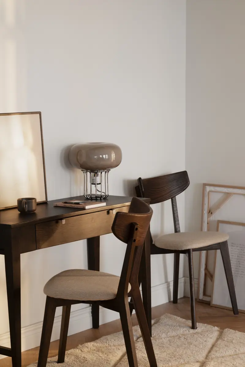 Confetti avlastningsbord i massiv brunlackad ek. En låda med knoppar i metall. Enkelt att inreda ditt hem med och fungerar lika bra som skrivbord.
