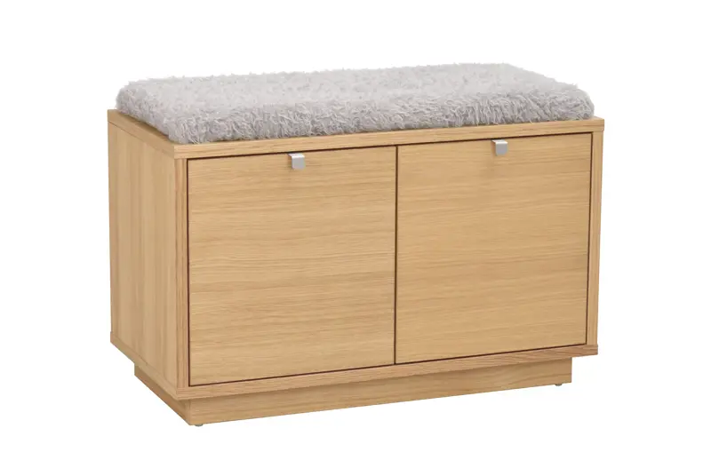 Confetti sittbänk i fanerad ek med dyna i fårskinnsimitation. Praktisk och stilren sittbänk med två rymliga lådor som tar hand om förvaringen. I