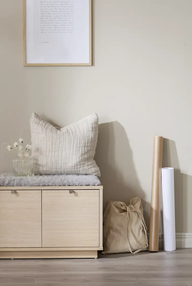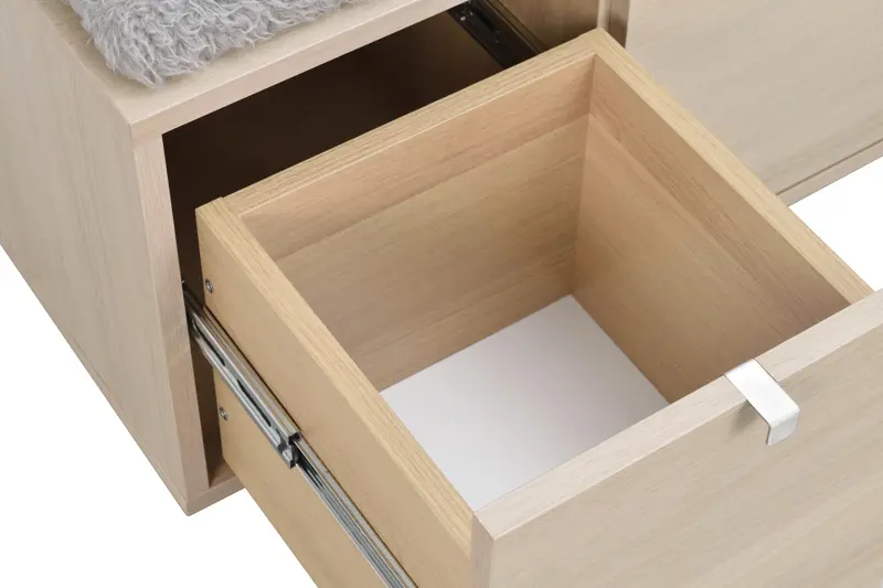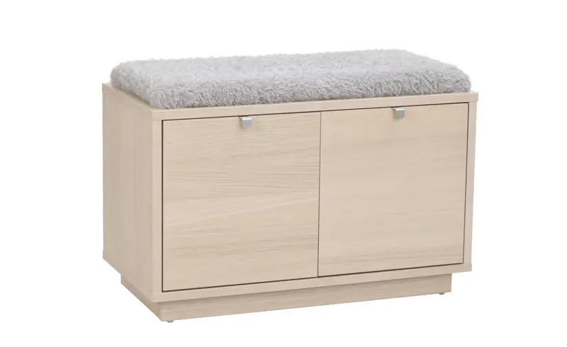Confetti sittbänk i fanerad vitpigmenterad ek med dyna i fårskinnsimitation. Praktisk och stilren sittbänk med två rymliga lådor som tar hand om förvaringen.