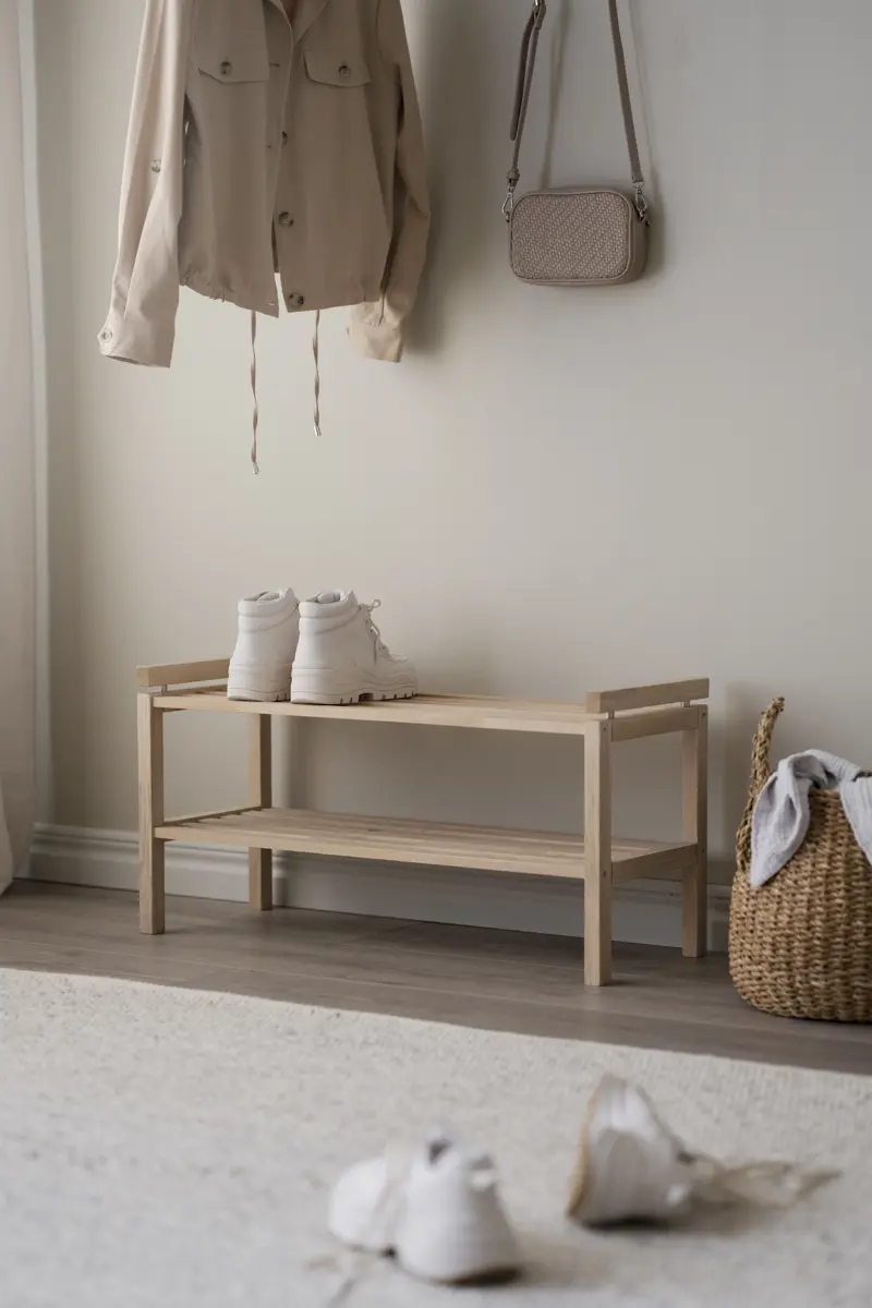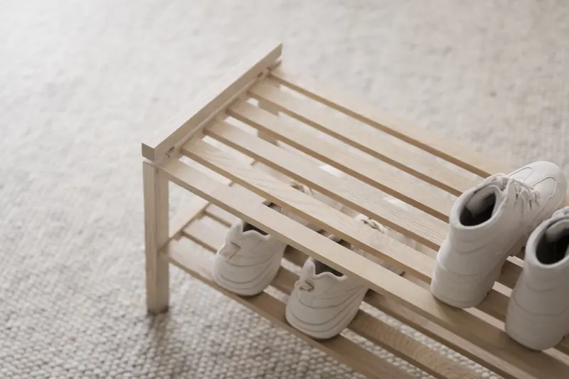 Confetti skohylla i massiv, vitpigmenterad ek. Stilren design med hyllor i två nivåer.