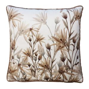 Vackert kuddfodral i mjuk sammet med blommönster i linnefärg på en vit botten. Kuddfodralet har en enfärgad passpoal runt om och har även en dold dragkedja nertill. Kuddfodralet är likt på båda sidorna.