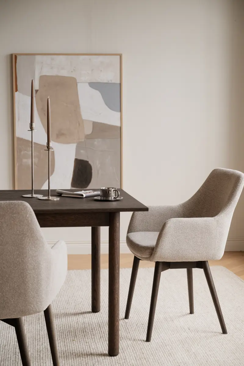 Denley karmstol i ljusbeige textil och bruna ekben är en tidlös och inbjudande sittmöbel som kombinerar mjuk komfort med ett harmoniskt och varmt uttryck. Den generösa sitsen och de integrerade armstöden ger ett omslutande stöd som gör stolen extra bekväm – perfekt för långa middagar och samtal runt matbordet. Sitsen är klädd i ett mjukt tyg med en något grövre struktur, vilket skapar en levande och taktil känsla som ger rummet både djup och karaktär.