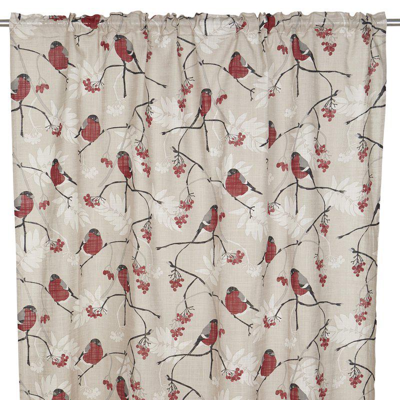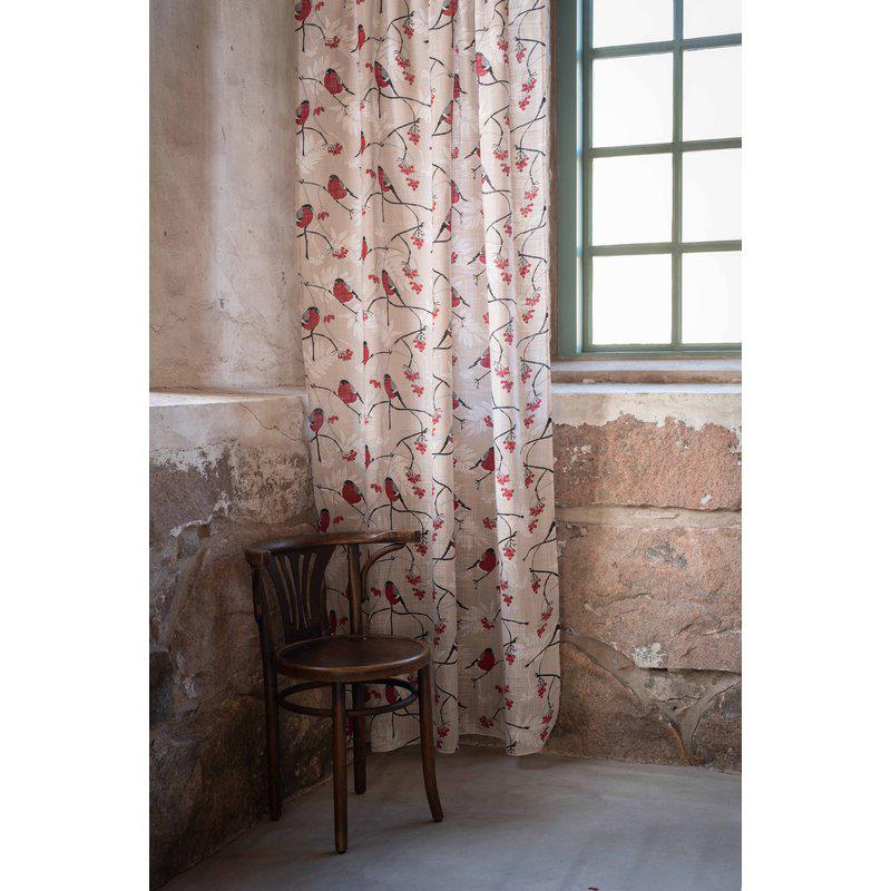 Multibandsgardin i mjuk bomullsslub med ett charmigt mönster av domherrar som sprider en hemtrevlig och vintrig känsla. Det levande slubtyget ger gardinen en naturlig struktur och ett rustikt uttryck. Kommer här i färgen greige.