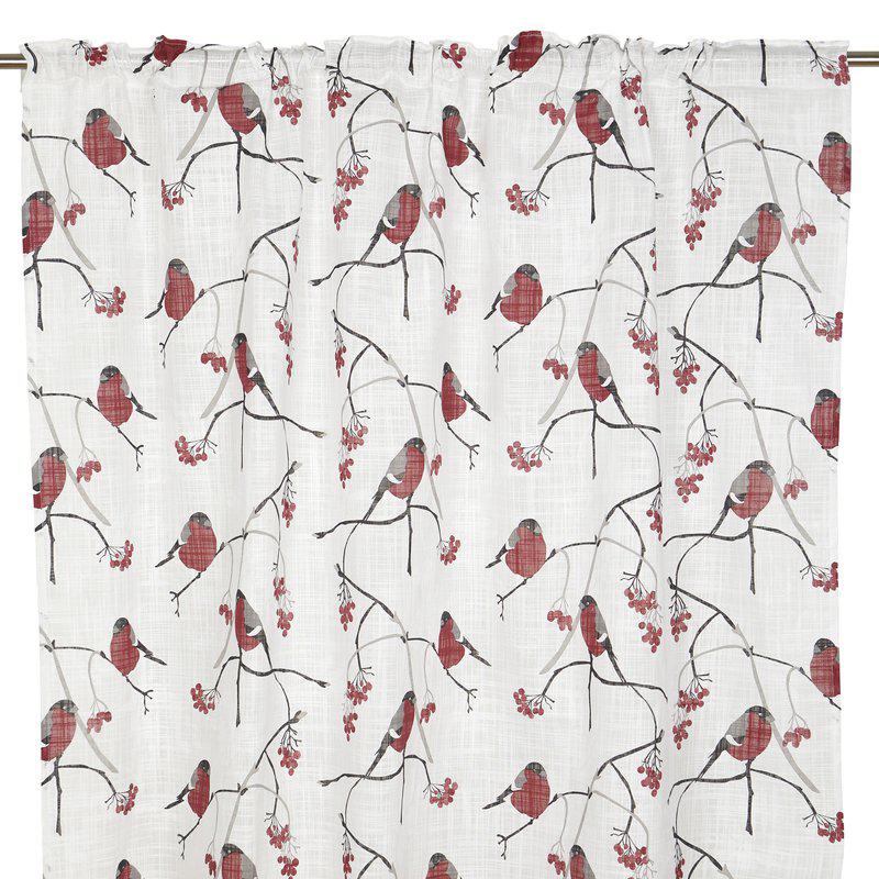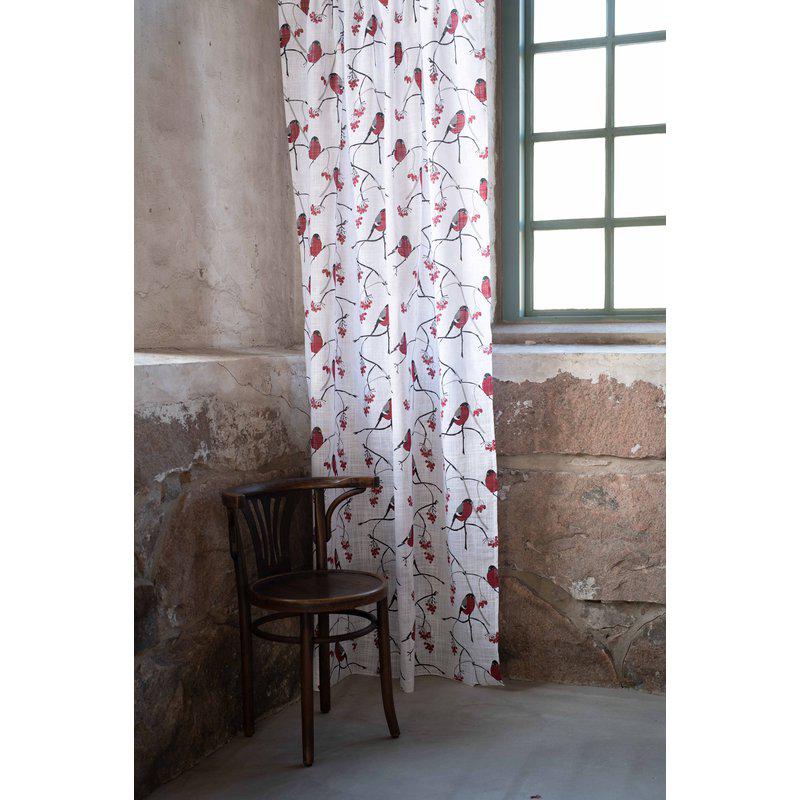 Multibandsgardin i mjuk bomullsslub med ett charmigt mönster av domherrar som sprider en hemtrevlig och vintrig känsla. Det levande slubtyget ger gardinen en naturlig struktur och ett rustikt uttryck. Kommer här i en fin vit färg med röda fåglar.