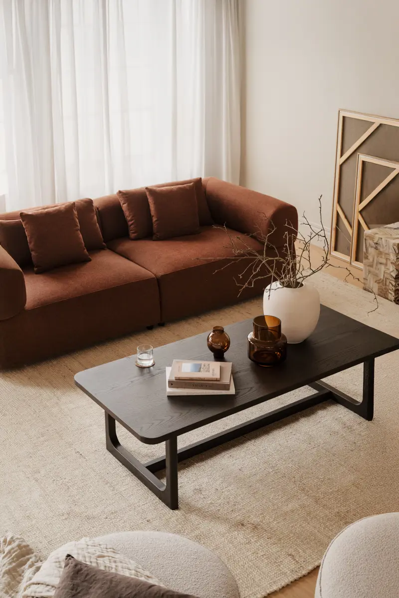 Driscoll är ett stilrent och generöst soffbord i brun ek som kombinerar funktion med form. Bordsskivan är fanerad med massiva kanter, vilket ger en gedigen känsla och hög kvalitet. De rundade hörnen möter de raka linjerna i en harmonisk balans som skapar ett modernt men tidlöst uttryck.