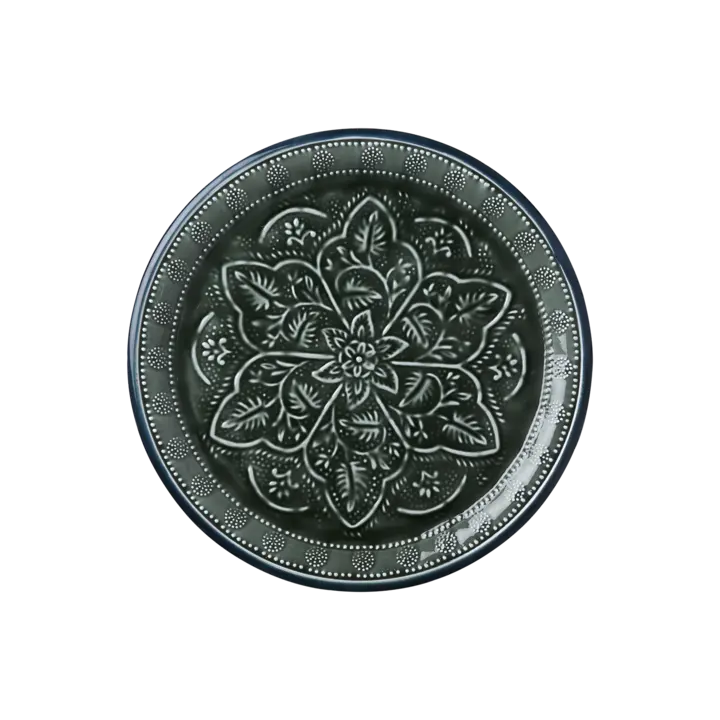 Fint grönt järnfat. Mönstret får sitt uttryck genom en maskin. Är pulverlackad, slutligen läggs en emaljbeläggning för att ge ett polerat uttryck.