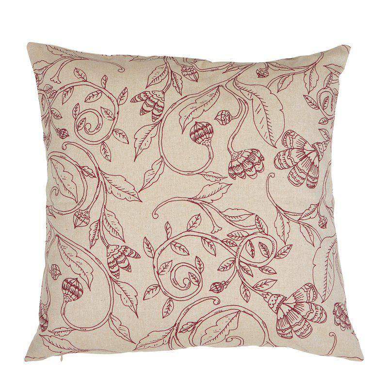 Stilrent kuddfodral tillverkat av återvunna material med ett snirkligt och stilfullt mönster i rött på en beige botten.