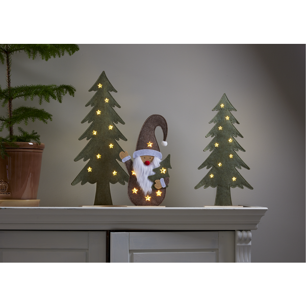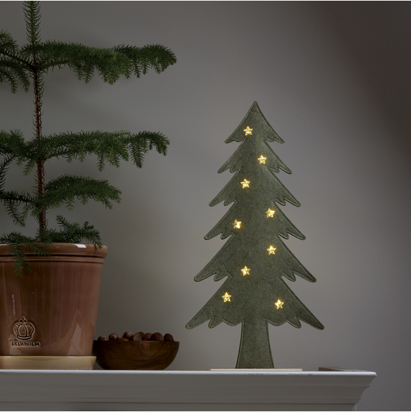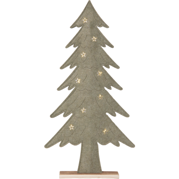 Mysig juldekoration i form av en gran gjord i filtmaterial. Små LED punkter lyser fint i det utskurna stjärnmönstret. Basen är gjord i trä. Fin dekoration som är lättplacerad, lyser fint och skapar julstämning. Drivs av batteri och har timer.