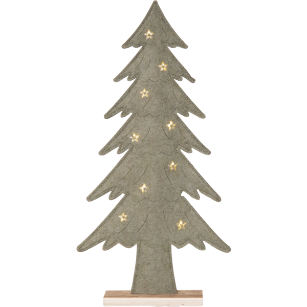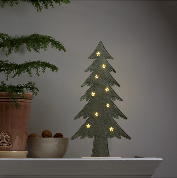Mysig juldekoration i form av en gran gjord i filtmaterial. Små LED punkter lyser fint i det utskurna stjärnmönstret. Basen är gjord i trä. Fin dekoration som är lättplacerad, lyser fint och skapar julstämning. Drivs av batteri och har timer.