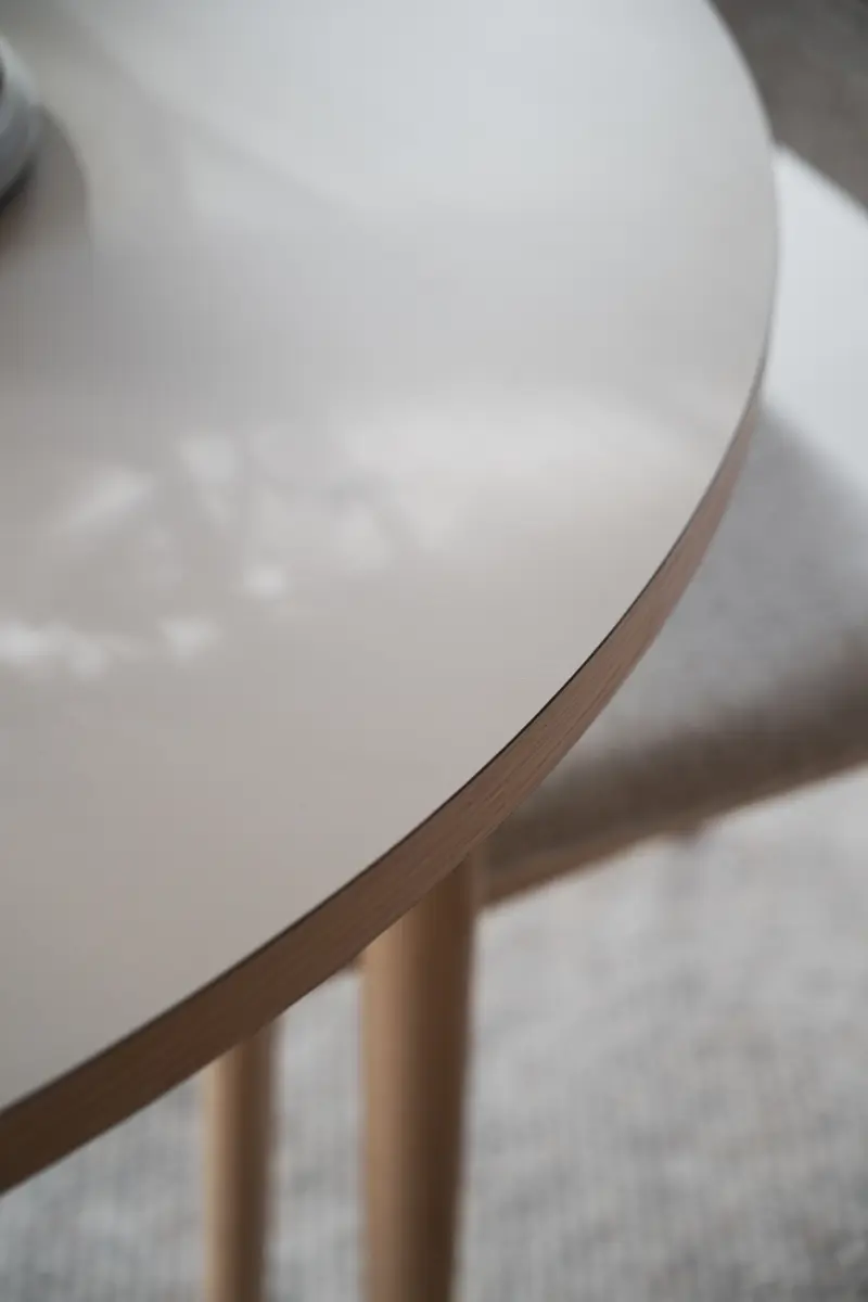 En hantverksmässig detalj under bordet är att sargen löper förbi benen i en mjukt formad design, en genomarbetad lösning som ger bordet ett unikt och stilrent uttryck.