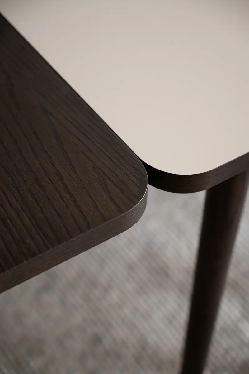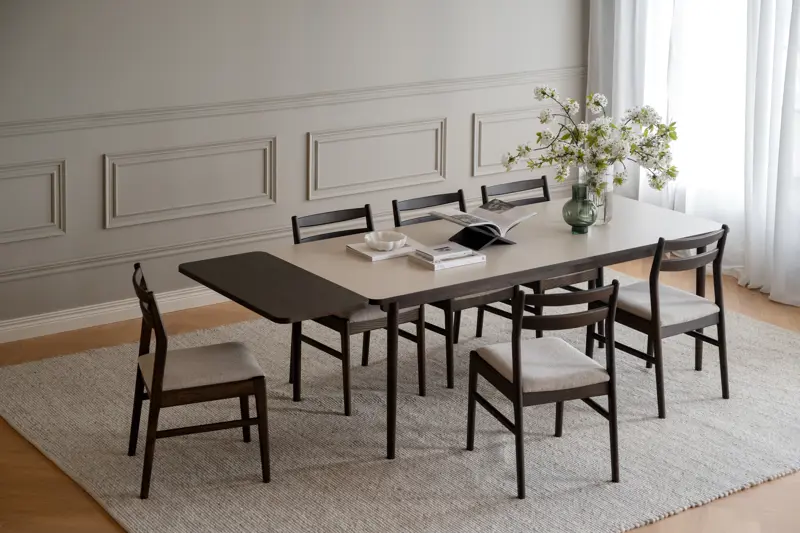 Tilläggsskivorna är gjorda i formstabil ekfaner och matchar matbordets kantlist och ben. En trevlig detalj som skapar ett långt matbord med karaktär.