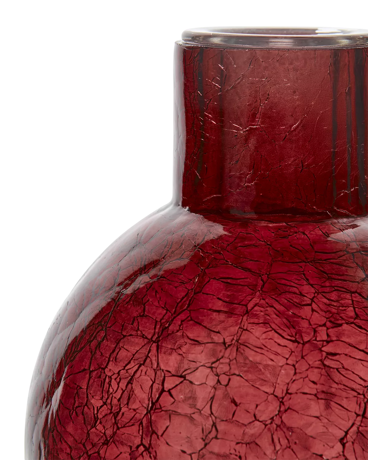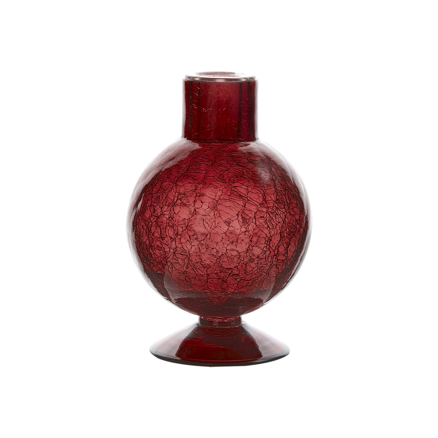 Vacker munblåst ljusstake i färgen burgundy. Med sitt krackelerade glas får den ett exklusivt utseende. I ljusstaken rymmer du kronljus med Ø2,2cm ljus.
