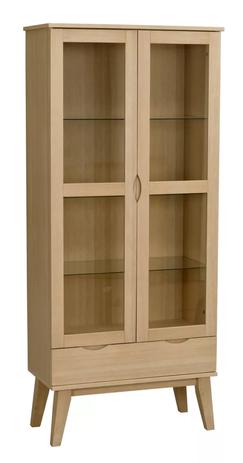 Stilrent och rymligt vitrinskåp i klarlackad ek med glasdörrar samt en låda. Mjukstängande låda och dörrar samt flyttbara hyllplan i härdat glas. Vitrinskåpet ingår i vår breda kollektion Filippa som även har flera matchande matbord och soffbord i olika storlekar.