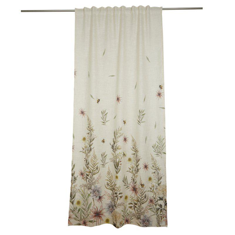 En gardin som har ett elegant ”väx-upp-mönster” där blommor och blad försiktigt klättrar uppåt från gardinens nedre kant, vilket ger ett levande intryck. Tyget är en noggrant utvald blandning av polyester och lin, vilket skapar en mjuk och naturlig textur med ett lätt och luftigt fall. De har påsytt multiband och kan hängas upp med rynkbandskrokar, fingerkrokar, kanal samt dold hälla.