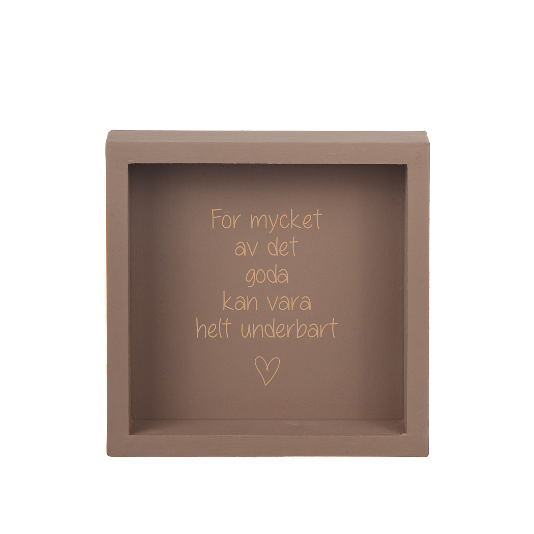 "För mycket av det goda kan vara helt underbart". Tavlan kommer här i en fin nougatbrun färg med guldig text.