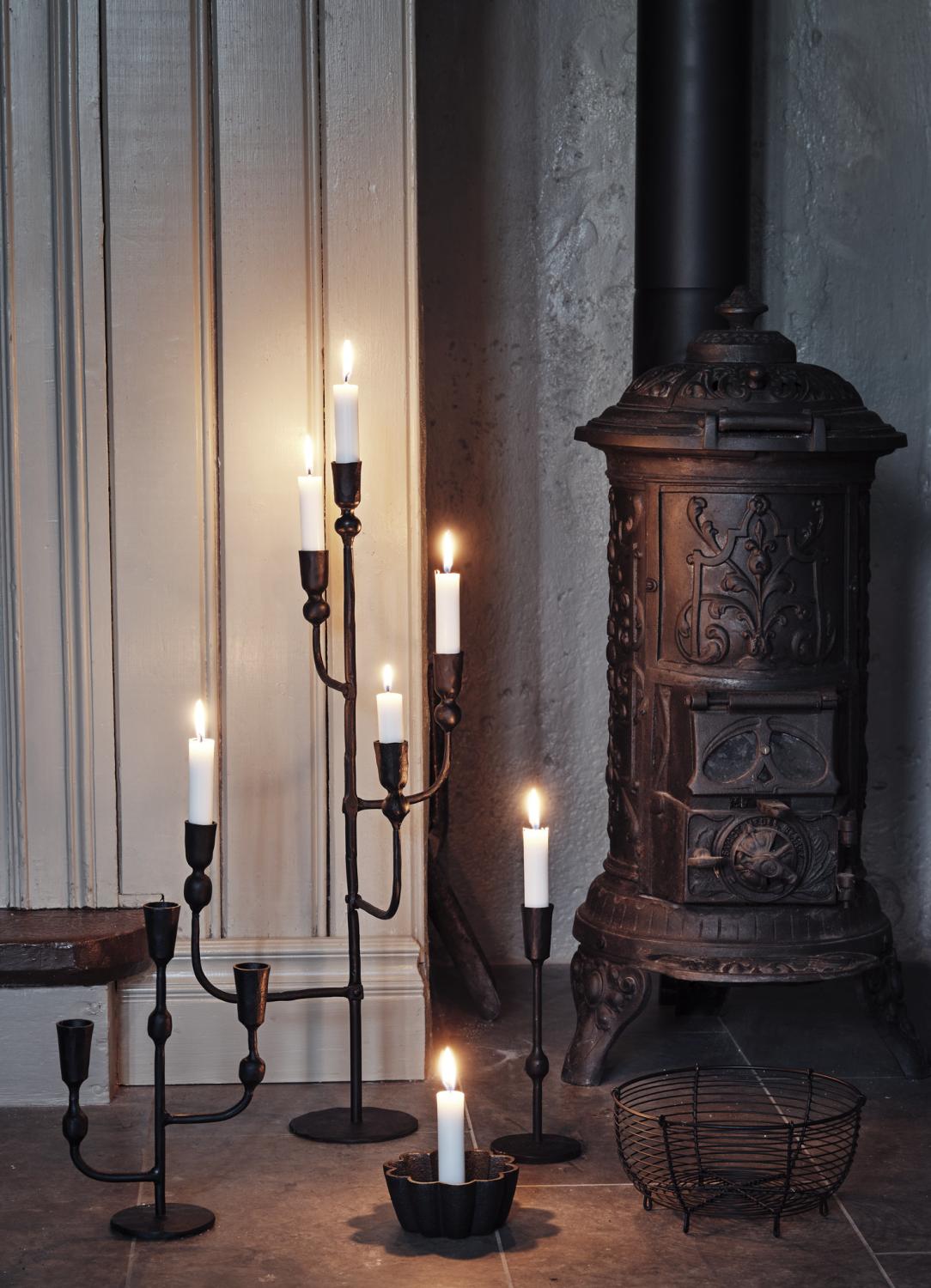 Gedigen ljushållare för tre kronljus i svart gjutjärn. Gjutjärn är ett slitstarkt material som passar fint i ett hem med gammaldags, lantlig och rustik stil.
