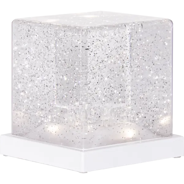 Batteridriven bordsdekoration med glittrande vätska. Inbyggd fläkt med motor ger en vacker dekoration med effekten av att det snöar inuti. Den inbyggda timern gör det lätt att ställa in när produkten ska lysa. Dekorera till jul och advent för den perfekta julkänslan. Placera iskuben i en hylla eller på ett bord och tänk på att inte placera den i direkt solljus.