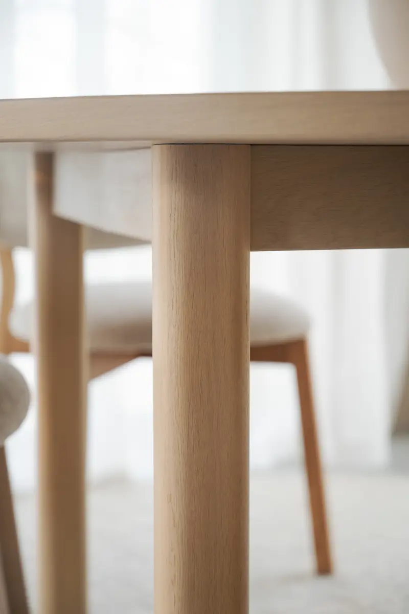 Designens balans mellan raka och rundade linjer ger Gifford ett harmoniskt och elegant uttryck. De rundade benen bidrar till ett mjukt formspråk och skapar en stabil helhet som samtidigt känns visuellt lätt. Kombinationen av den ovala siluetten och de mjuka detaljerna gör bordet till ett naturligt blickfång i rummet, utan att ta över.