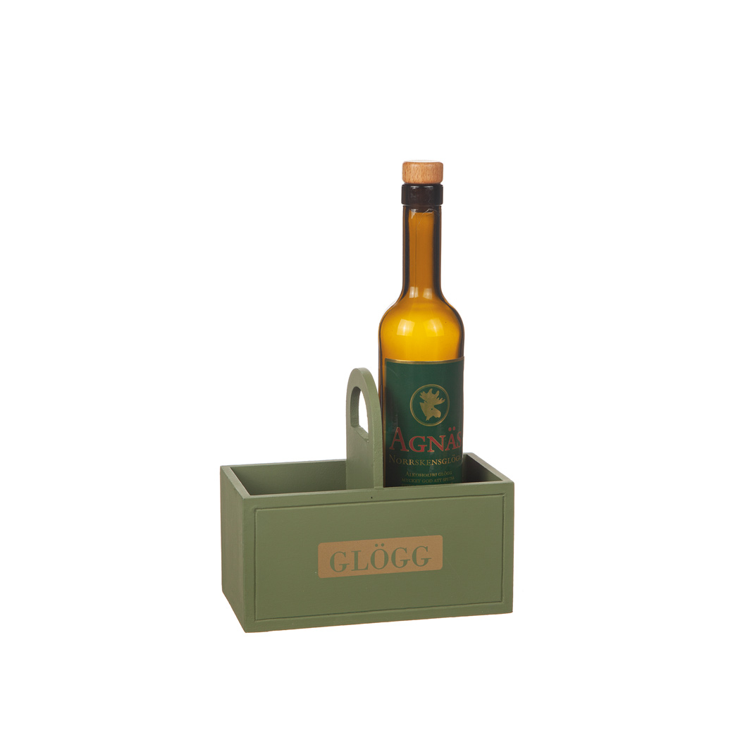 Snygg trälåda i en varm grön färg med texten "Glögg" i guld. Det finns två stycken fack där det ryms glöggflaskor. En perfekt present att ta med till middagsbjudningen runt jul.