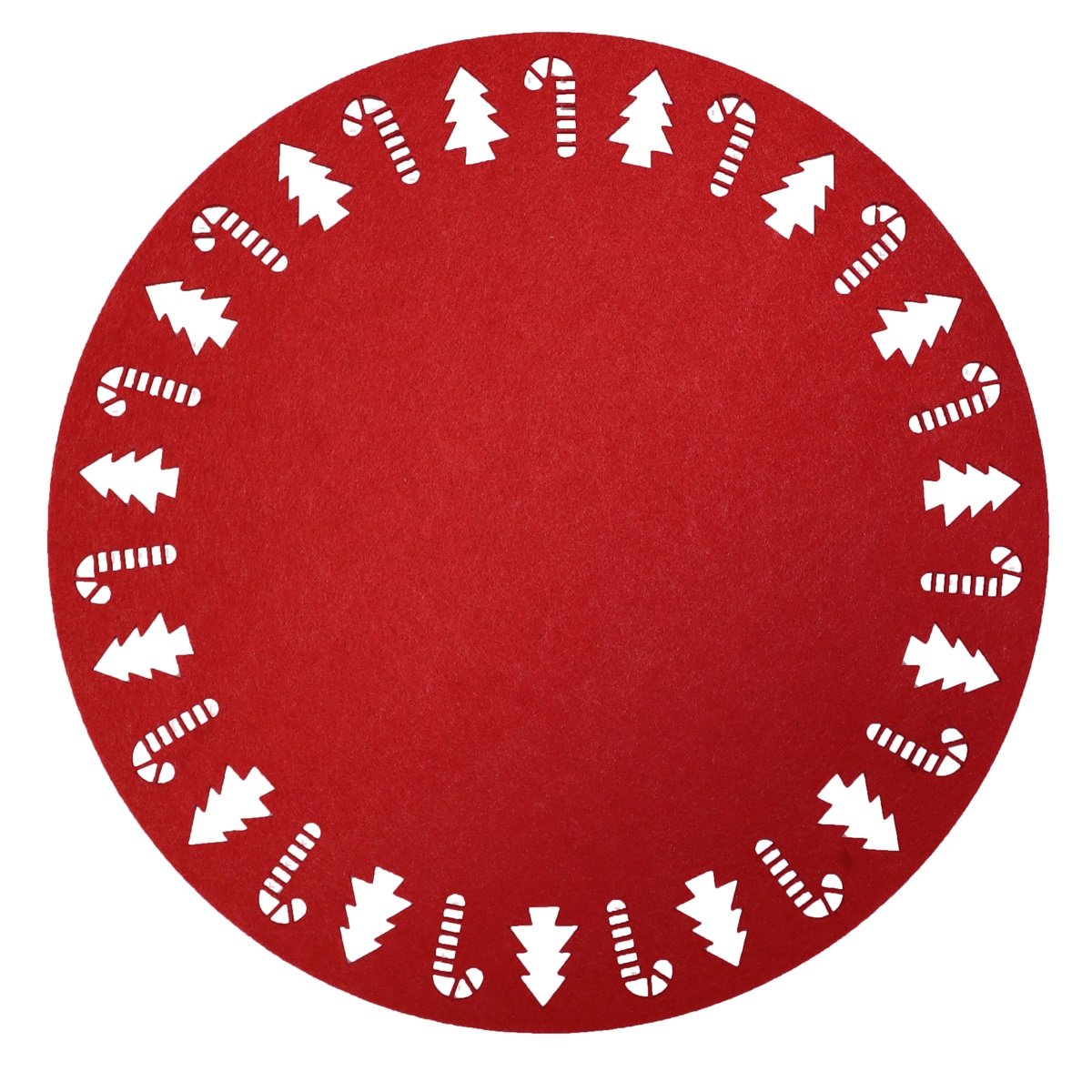 Rund filttablett med mönster av granar och polkagrisar runt om.